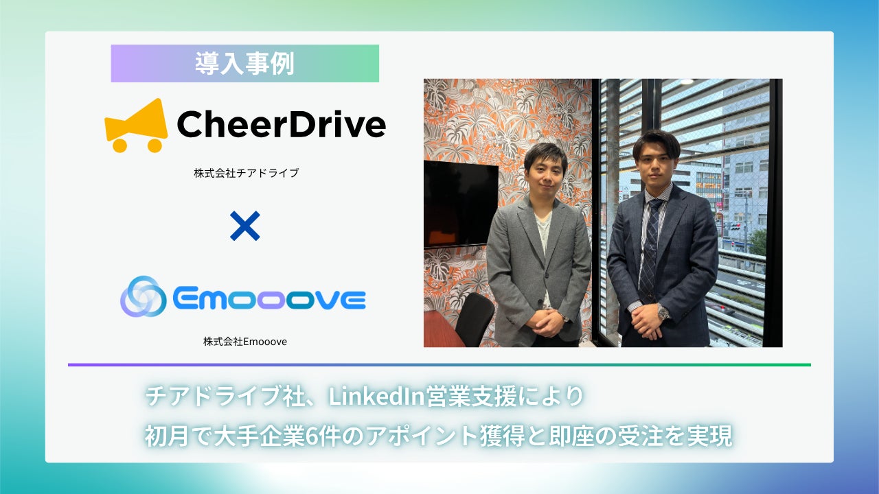 新時代の営業手法を提案する株式会社Emooove(本社:東京都渋谷区、代表取締役CEO:藤澤諒一)は、株式会社チアドライブにLinkedIn営業支援を導入し、初月で大手企業6件のアポイント獲得と即座の受注実現ができたことをお知らせします。