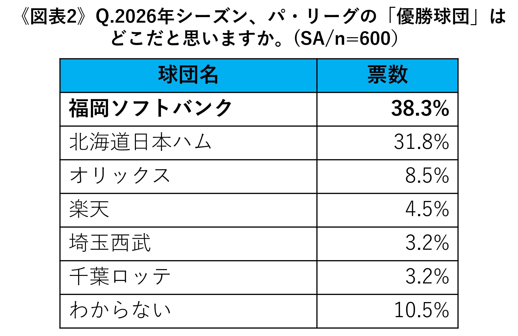 セ・パ両リーグそれぞれの優勝予想について聞いたところ、セ・リーグは1位阪神、2位巨人、3位横浜DeNAという結果になりました《図表1》。阪神は50.5%と全体の半数以上を占め、ファンの間では昨年王者が圧倒的な1位となりました。一方でパ・リーグは1位福岡ソフトバンク、2位北海道日本ハム、3位オリックスという結果に《図表2》。