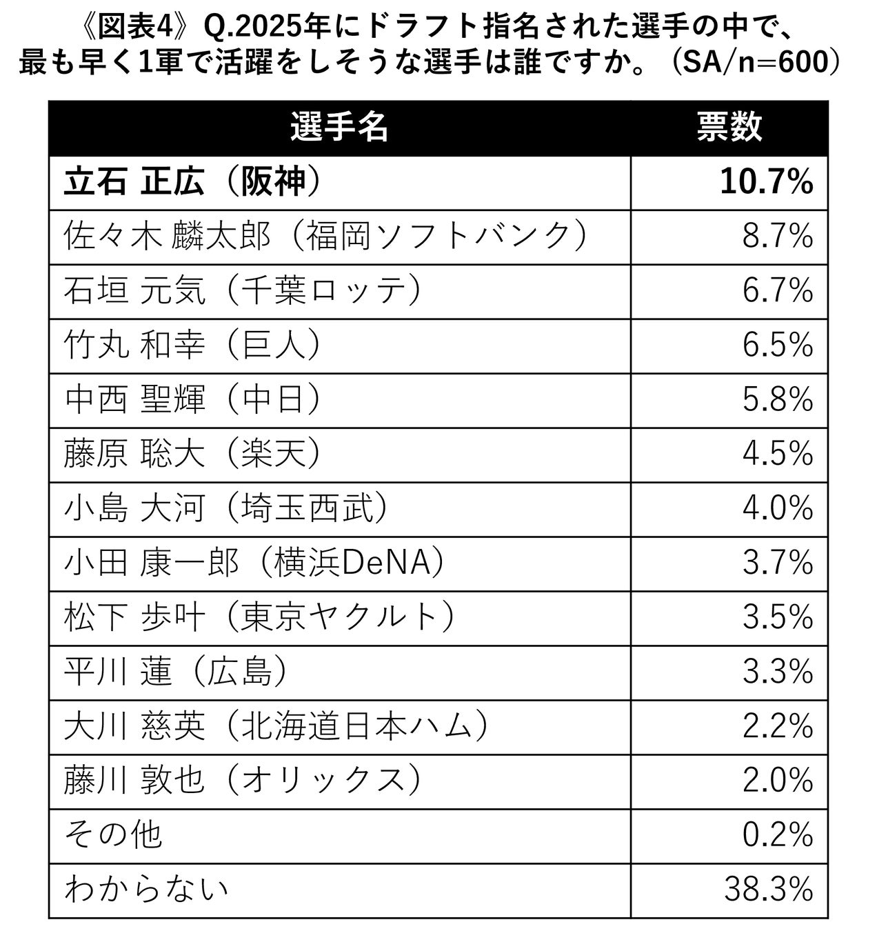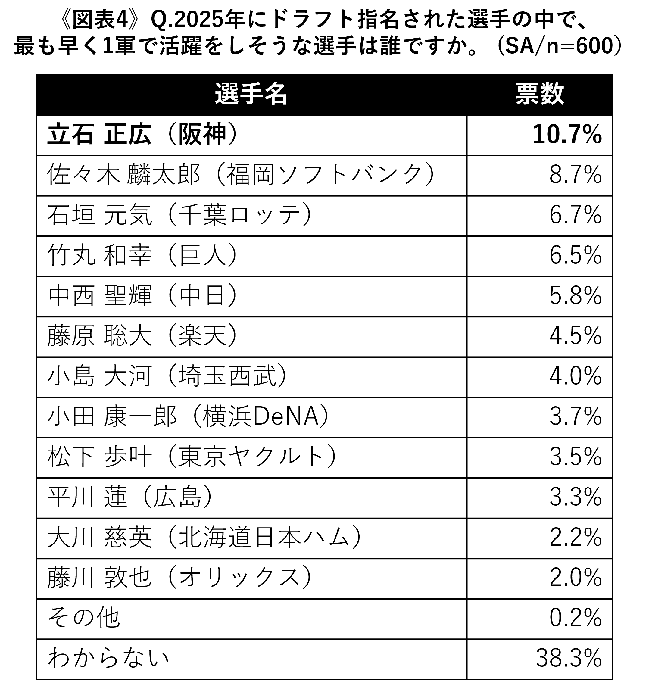 2026年シーズンに最も活躍しそうなルーキーについて聞くと、1位は立石 正広選手(阪神)、2位は佐々木 麟太郎選手(福岡ソフトバンク)3位は石垣 元気選手(千葉ロッテ)となりました《図表4》。