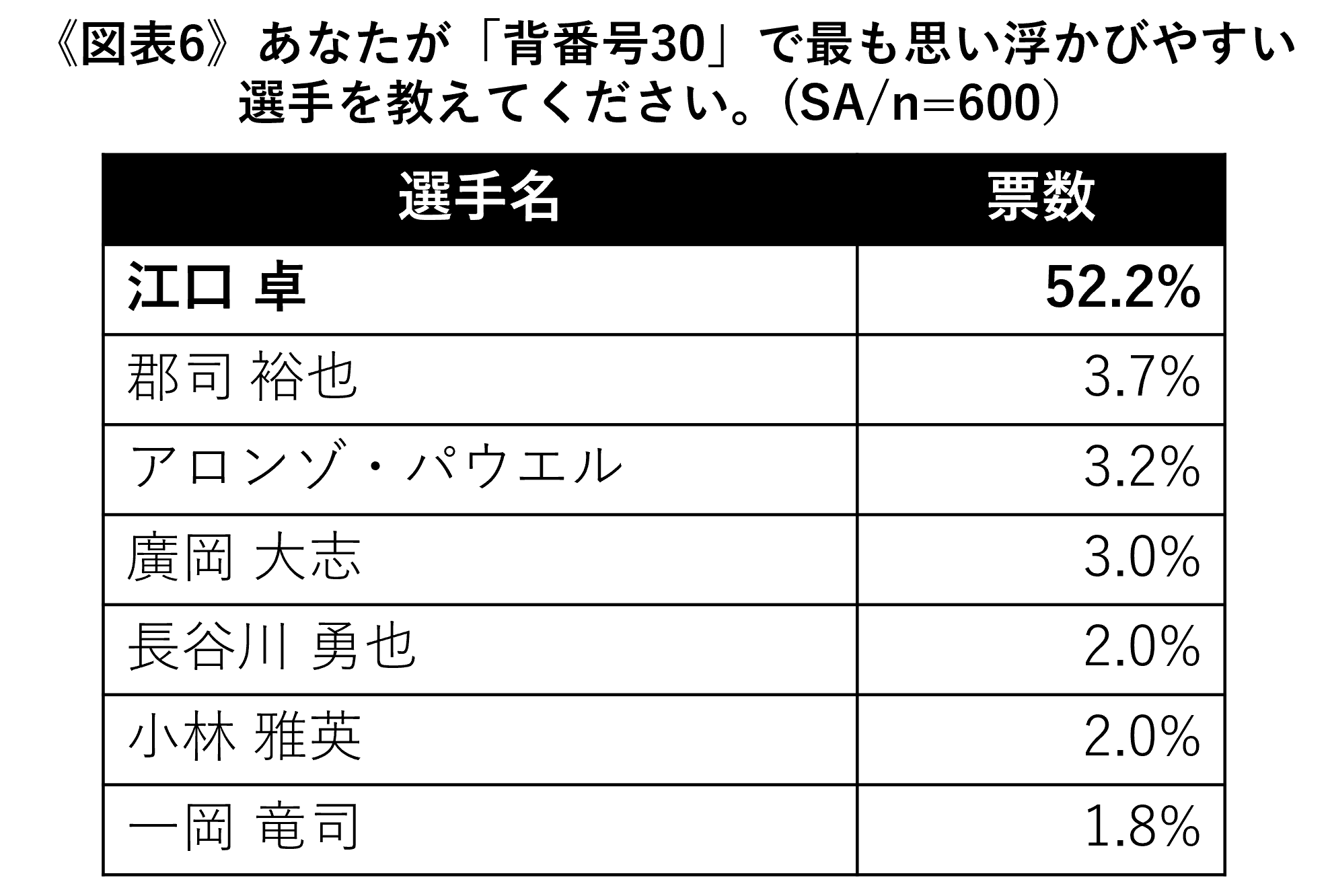 背番号30で想起されやすい選手について聞いたところ、1位は江川 卓選手、2位は郡司 裕也選手、3位はアロンゾ・パウエル選手となりました《図表6》。