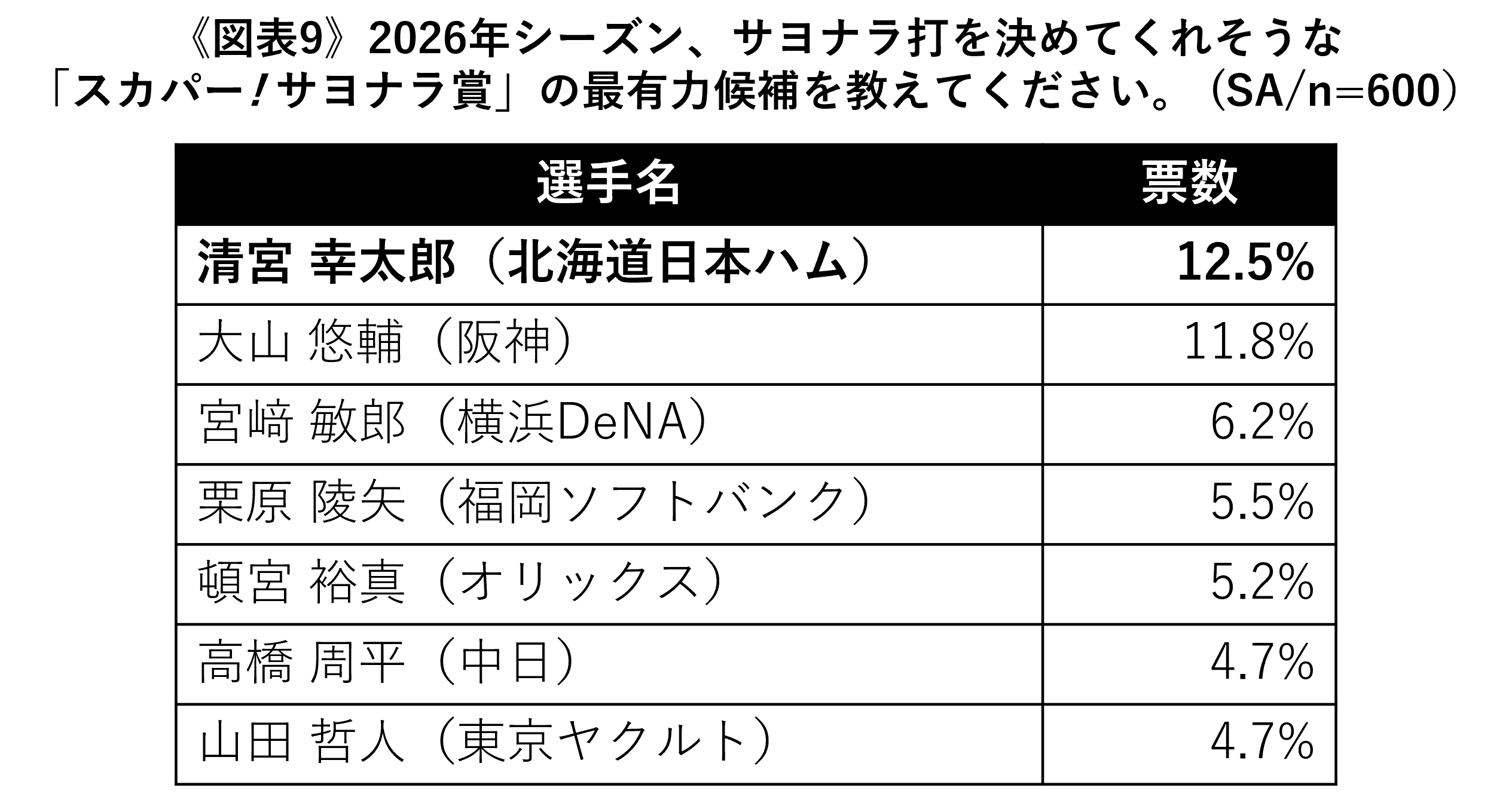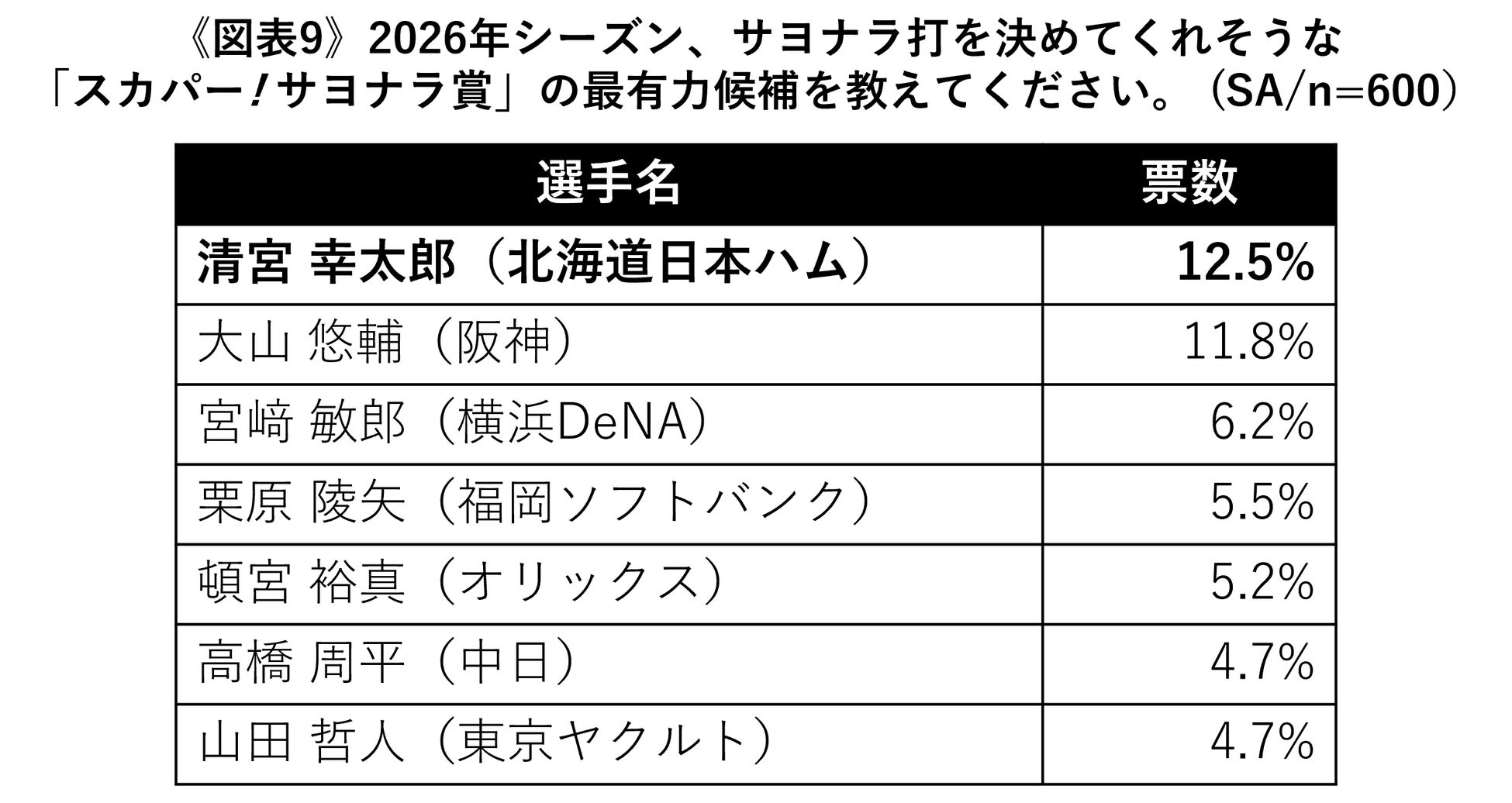 2026年シーズン「ここぞ」という場面でサヨナラ打を決めてくれそうな「スカパー! サヨナラ賞」の最有力候補について聞くと、1位が清宮 幸太郎選手(北海道日本ハム)、2位が大山 悠輔選手(阪神)、3位が宮﨑 敏郎選手(横浜DeNA)という結果となりました《図表9》。