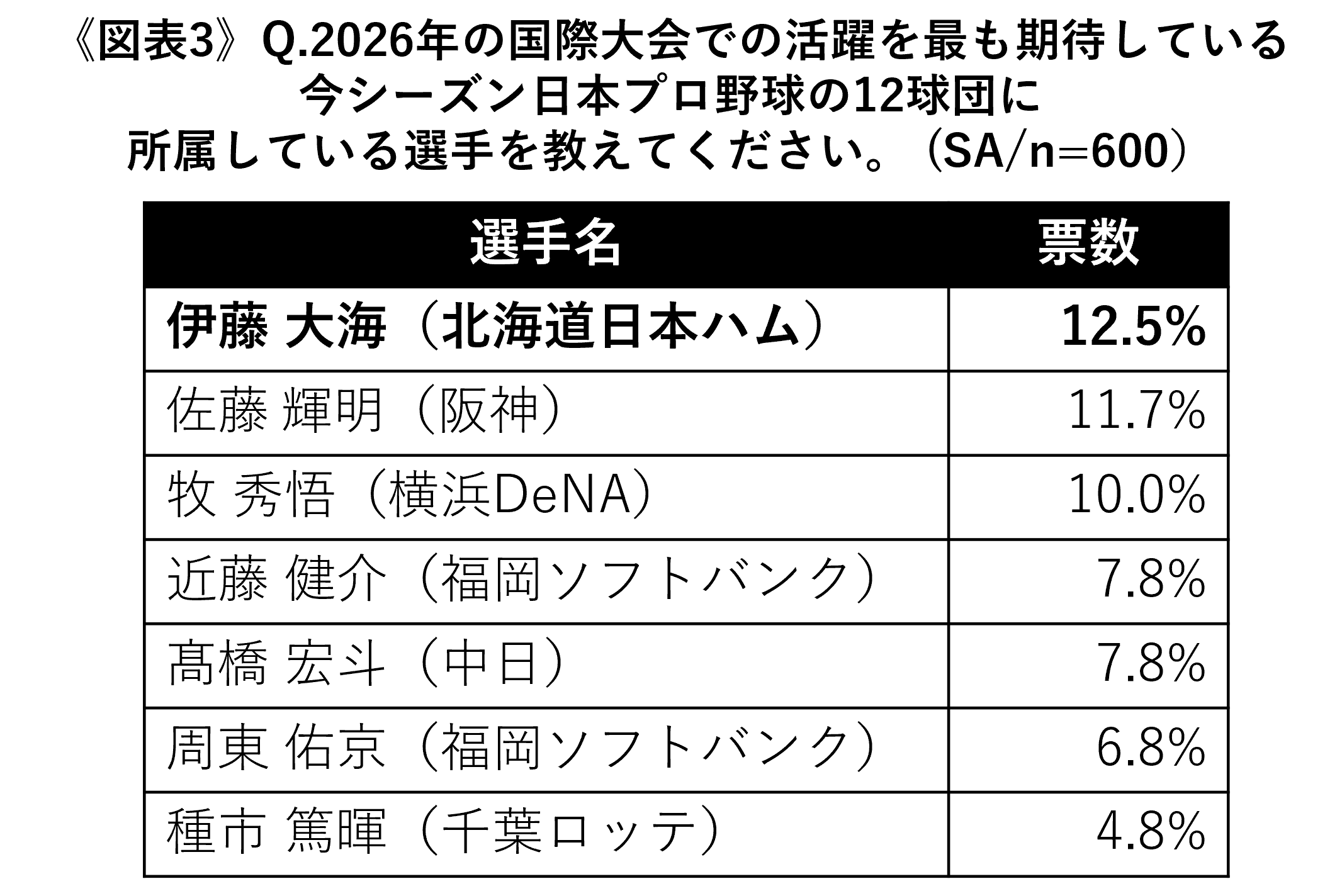 3月に開催される国際大会での活躍を期待しているNPBの選手を聞くと、1位伊藤 大海選手(北海道日本ハム)、2位佐藤 輝明選手(阪神)、3位牧 秀悟選手(横浜DeNA)という結果になりました《図表3》。伊藤 大海選手を選んだ理由にファンは「日本ハムのエースとなり、レベルが一段上がった」や「大谷選手に負けない活躍を見せてくれる」と日本代表のエースとしての期待感が見られました。