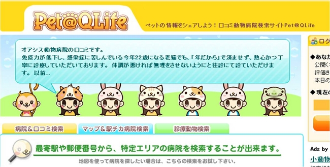 QLifeがマピオンに、全国約7,200件の動物病院施設情報や口コミ情報を供給開始
