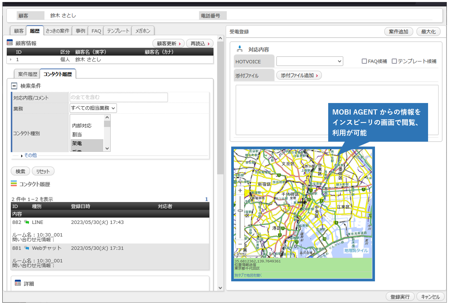 さまざまなチャネルの応対履歴や位置情報などを、インスピーリ画面上でシームレスに表示