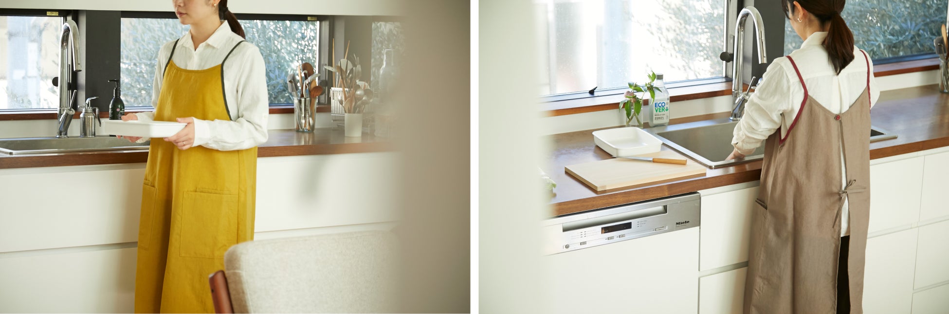 毎日、そして長く大切に愛用していただけるエプロンができました。未体験の軽さ、着脱のしやすさ、二重のポケット、シワにならない速乾性、リネンのような見た目なのに雨傘と同レベルの撥水効果という機能性に感激。エプロンを日頃使う方もちろん、そうでない方にも使うメリットを感じていただけると思います。