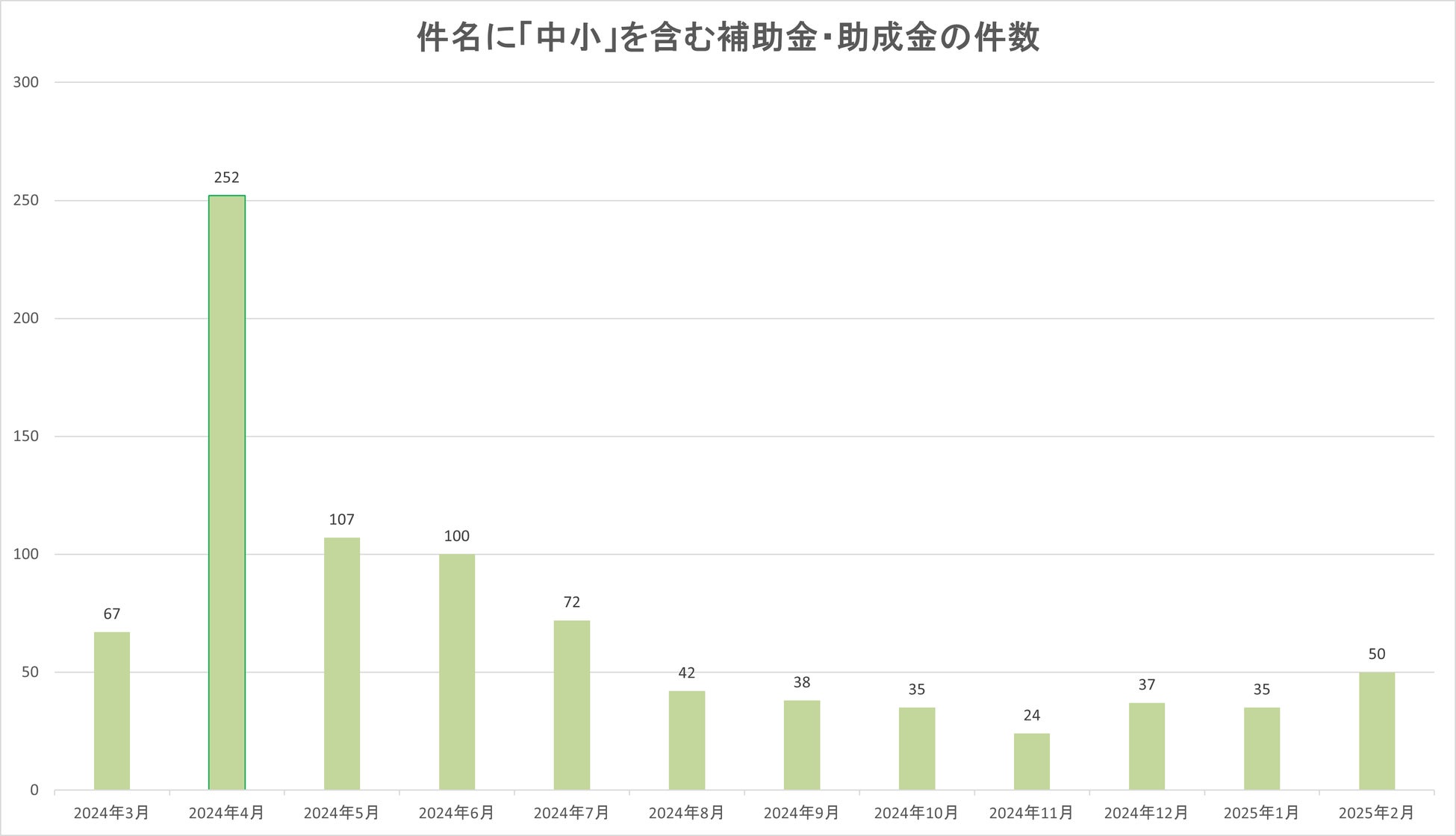 件名に「中小」を含む補助金・助成金が、月別に何件登録されたかを表示したグラフです。