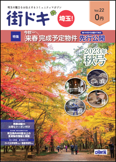 「街ドキ」は、2017年9月に株式会社CHINTAIが発行を開始した埼玉県限定のフリーマガジンです。今年で5周年を迎え、毎号「暮」「観」「食」「遊」をテーマに埼玉県のコアな情報と魅力的なスポットを紹介しています。また、埼玉県内のお店で使えるお得なクーポンや、街ドキ編集者おすすめの賃貸物件情報を800室以上掲載。埼玉での暮らしをより豊かにすることができるフリーマガジンとなっております。