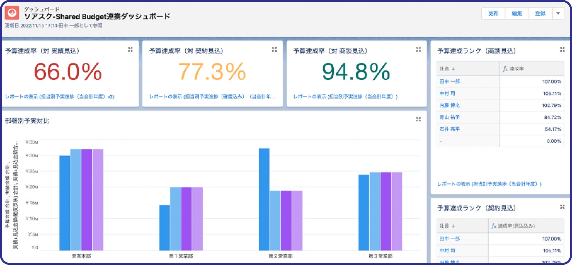 パッケージ標準でダッシュボードを提供。 Shared budgetで管理する"予算"に対し、ソアスクで積み上げた"実績"及び"見込み"を対比させ予実管理を実現。 予算に対する実績分の対比に加え、進行中商談の確度を加味した予定(実績+見込み)による予算対比も可能。