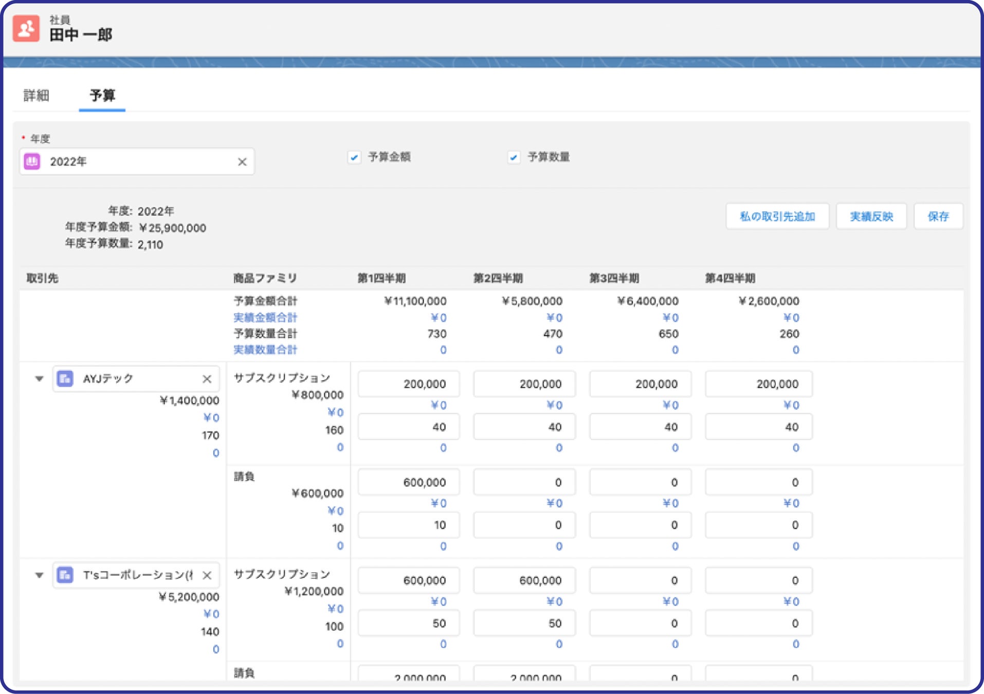 年/四半期/月などの単位で取引先、サービス・商品、などの粒度に応じた予算設定と予算登録。
