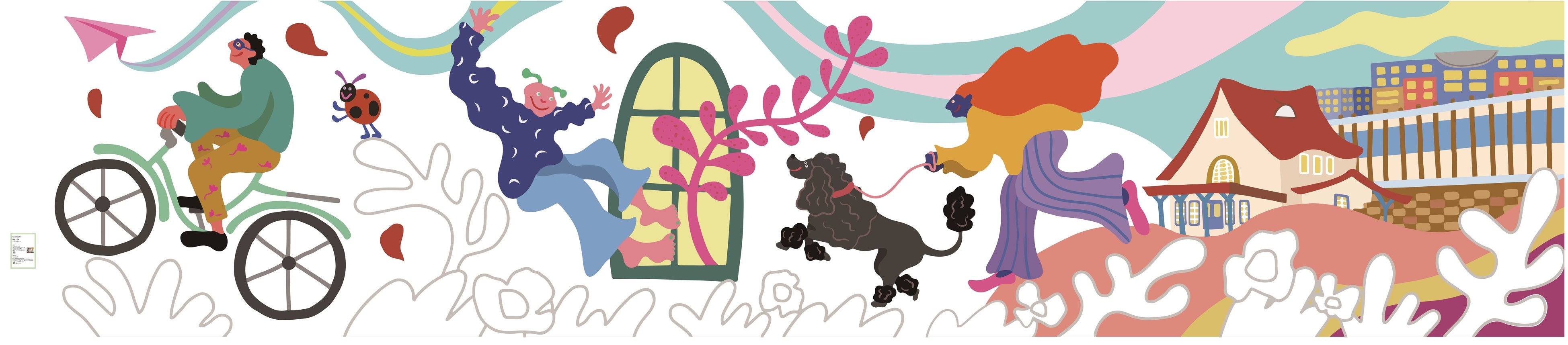 作品コンセプトには、「国立駅前がまちの昔といま、世代と世代、歴史と文化、いろいろなものがクロスするまちの結節点になってほしい」という想いが込められています。国立のまちがこれまで大切にしてきたもの、そしてこれから続く未来へのワクワク感や期待感をテーマに、国立のまちが明るい未来へと歩を進めていく姿や願いを表現しており、まちを利用する多様な立場の方々、花と緑が溢れるまち、国立市のシンボルである旧国立駅舎、市章に描かれる梅の花などから構成しています。