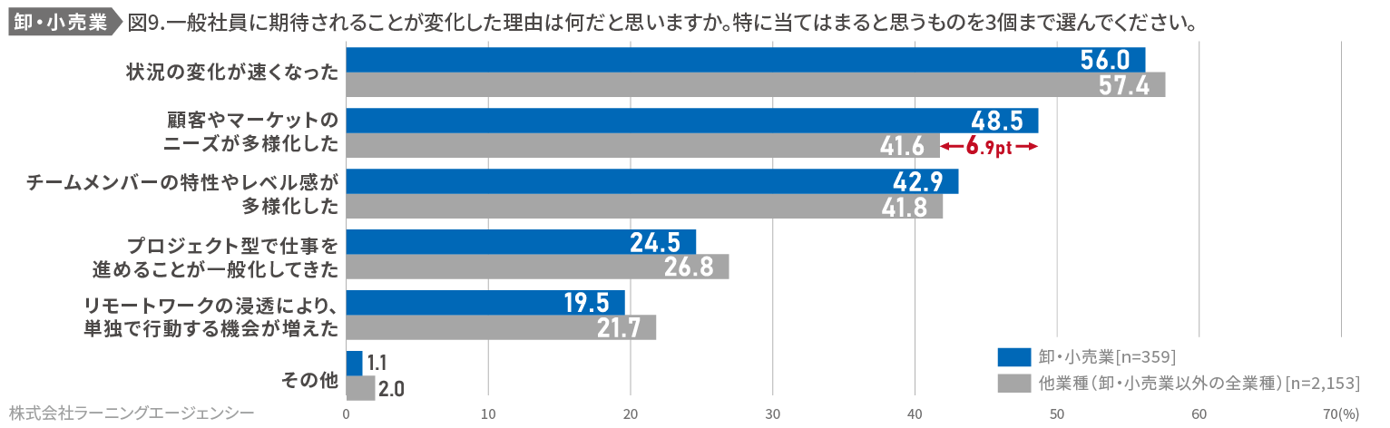 卸売業・小売業の一般社員にこうした役割の変化をもたらした理由は「状況の変化が速くなった」が最多で、56.0%の回答者から選ばれています。2番目に多く選ばれた「顧客やマーケットのニーズが多様化した」でも約半数の48.5%を占め、他業種より6.9pt多い結果となりました(図9)。