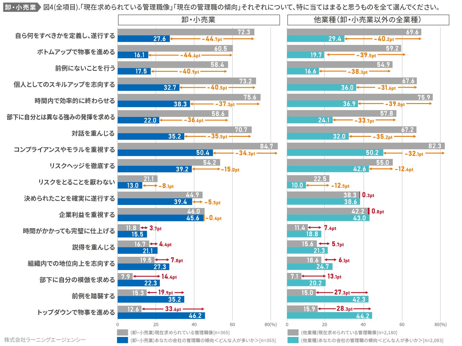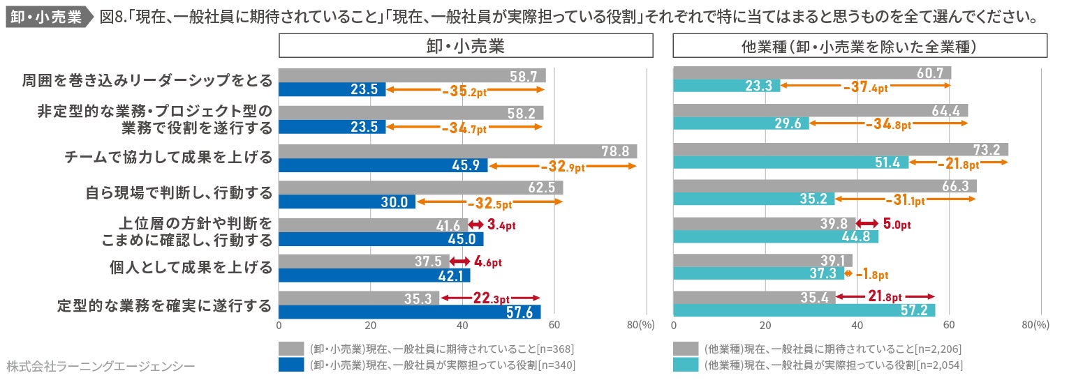 また、求められている役割と実態を比較すると「自ら何をすべきかを定義し、遂行する」が最も乖離が大きく、期待よりも実態のほうが44.7pt低い割合となりました。「ボトムアップで物事を進める」「前例にないことを行う」「個人としてのスキルアップを志向する」も、それぞれ44.4pt、40.9pt、40.5ptの乖離があり、期待より実態が低い結果に。特に「ボトムアップで物事を進める」と「個人としてのスキルアップを志向する」は他業種と比較しても期待と実態の間のマイナス幅がそれぞれ4.9pt、8.9pt大きく、卸売業・小売業ならではの特徴の1つとなっています(図4)。
