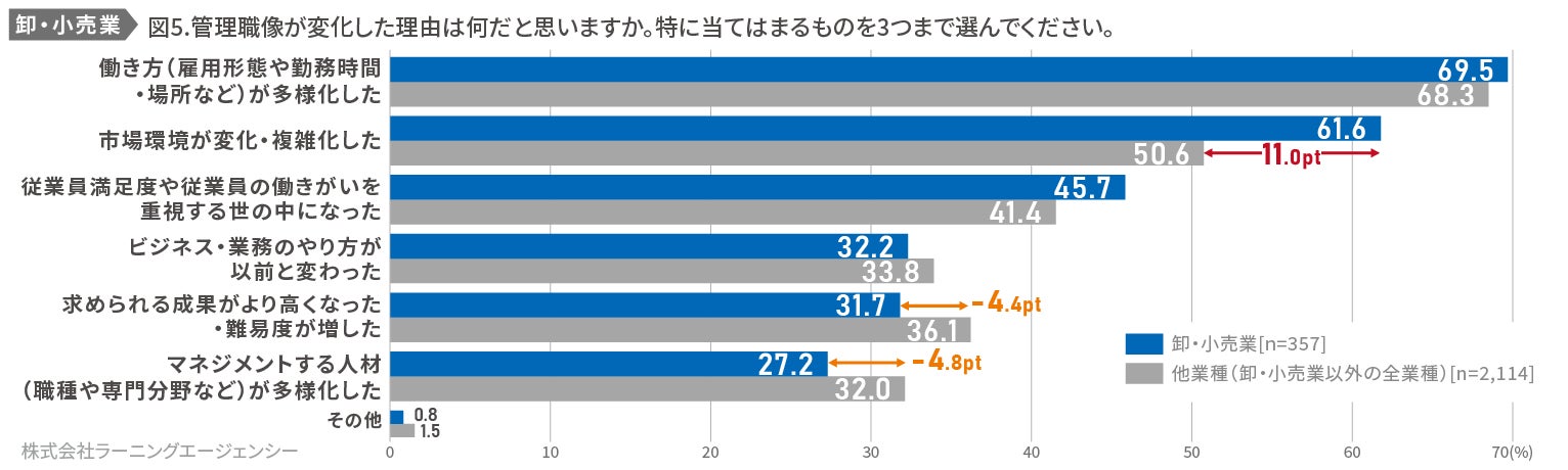 管理職像の変化が生じた理由について3つまで選んでもらったところ、最多となったのは他業種と同じく「働き方(雇用形態や勤務時間・場所など)が多様化した」で、69.5%を占めました。第2位、第3位も同様に「市場環境が変化・複雑化した(61.6%)」「従業員満足度や従業員の働きがいを重視する世の中になった(45.7%)」となっています。特に、卸売業・小売業では「市場環境が変化・複雑化した」を選ぶ割合が他業種よりも多く、その差は11.0ptでした。一方で、「求められる成果がより高くなった(31.7%)」「マネジメントする人材(職種や専門分野など)が多様化した(27.2%)」は、それぞれ他業種よりも4.4pt、4.8pt低い結果となりました(図5)。
