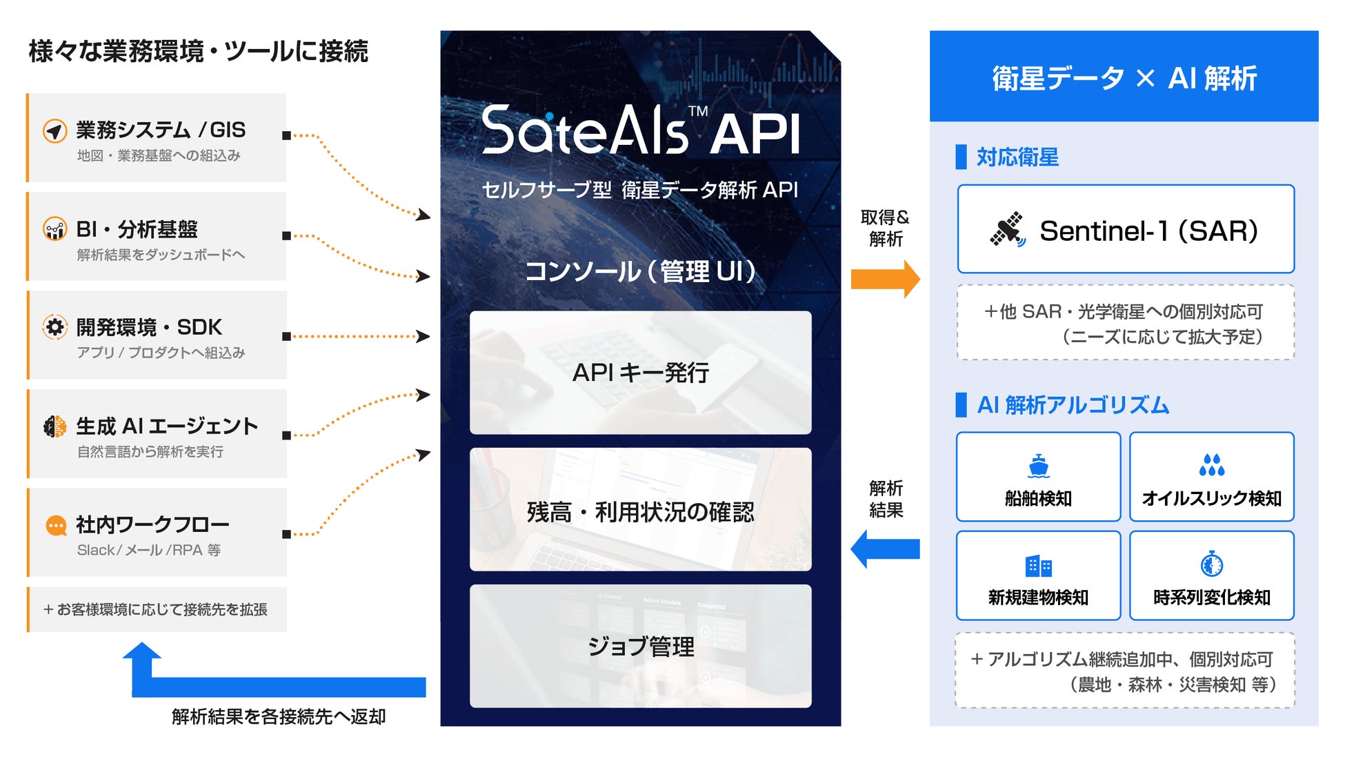 既存の仕組みへの直接統合 — GIS・業務基幹システム・BIダッシュボード・社内ワークフロー等から、APIリクエスト一つで解析を呼び出し。データ取得・前処理・モデル実行・結果配信まですべてSateAIs API側で完結します