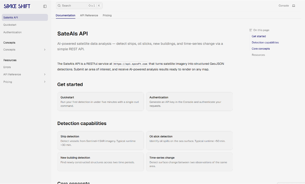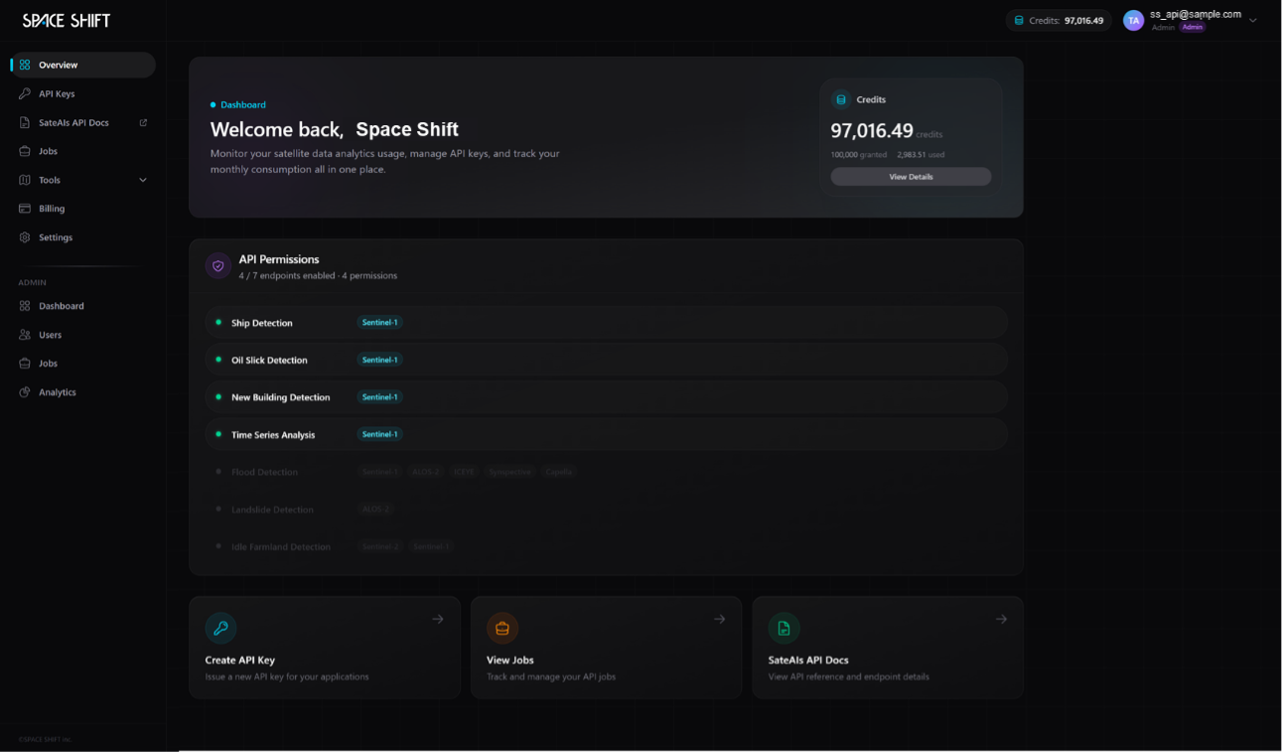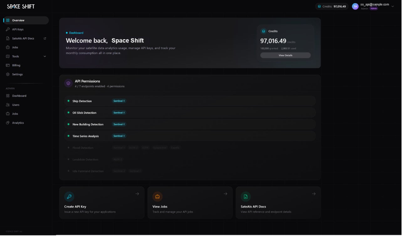 株式会社スペースシフト(本社:東京都千代田区、代表取締役:金本成生、以下「スペースシフト」)は、衛星データ解析ブランド「SateAIs ™(サテアイズ)」において、APIキー発行・解析実行・ジョブ管理・利用量可視化までをブラウザ上で完結できるセルフサーブ環境「SateAIs™ API」( https://console.spcsft.com/ ) のβ版提供を開始しました。