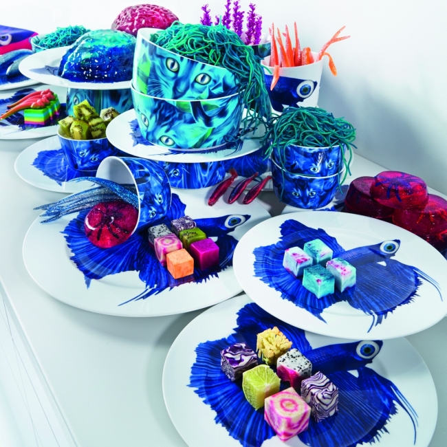ならではの意表を突くプリント柄が目を釘付けにする、テーブルウェアとホームテキスタイルのコレクション。五感を刺激するデザインで、先端ファッションやストリートカルチャーに敏感な層を「もっとラウドな生き方」へといざなうコレクションです。デジタルプリントによるリアルなプリント柄の食器やテーブルクロス、クッションカバー、ベッドリネンなど、約30のアイテムで構成されています。