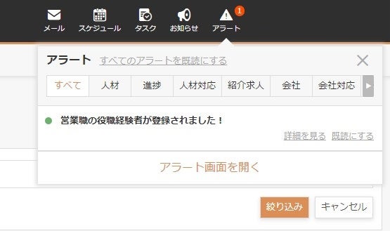 営業職で役職経験者が新規登録されるとアラート通知。狙いたい人材に早急にコンタクトが取れるようになります。