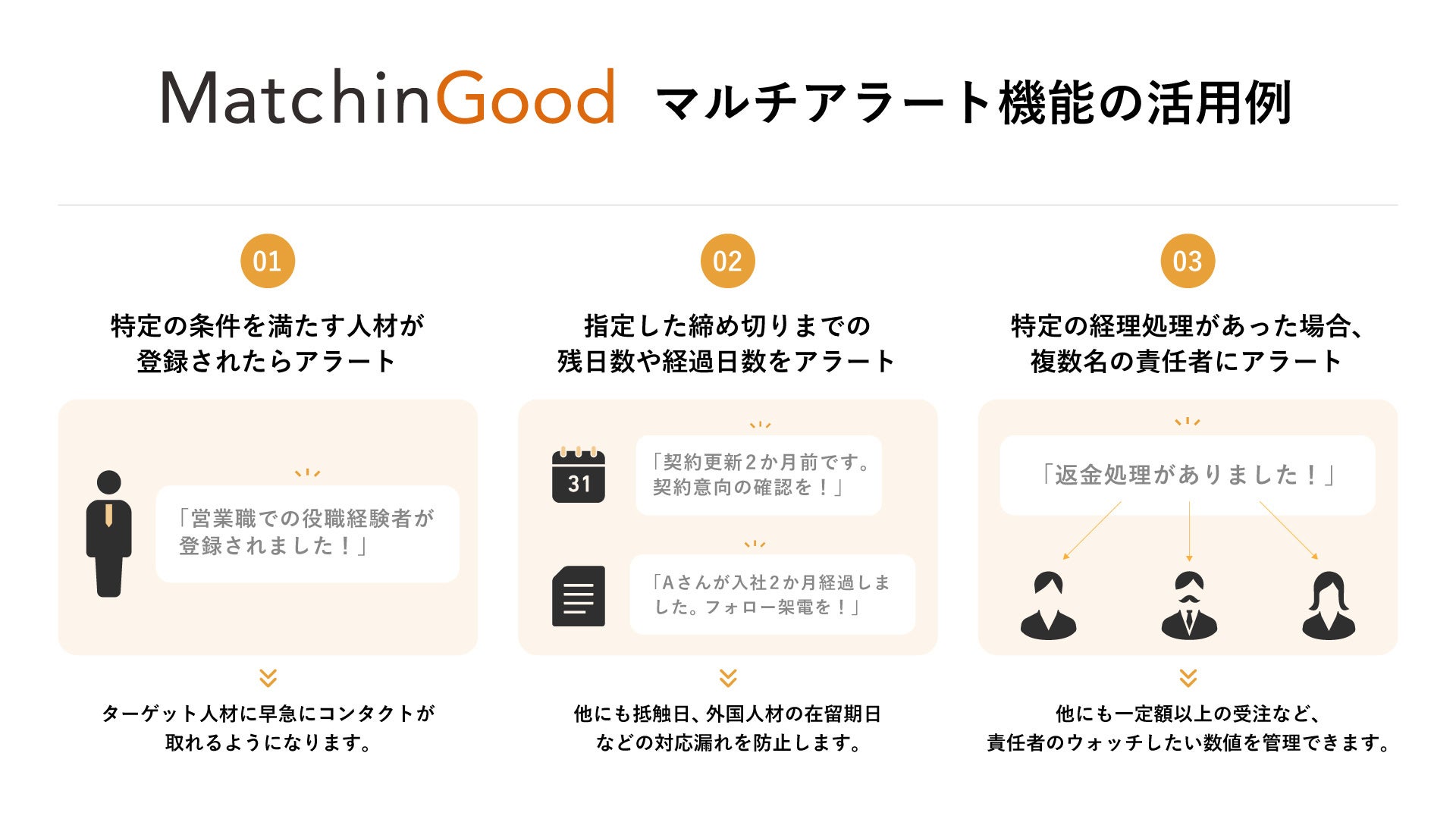 このたび、マッチングッドで管理するほぼ全ての項目に対して、特定の条件を満たすとアラートを表示させる新機能「マルチアラート機能」を追加しました。これにより、求職者対応や契約管理などの対応漏れをゼロにすることが可能になります。