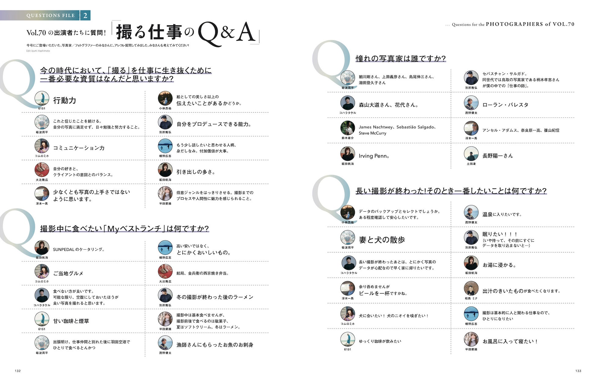今号に登場いただいた、写真家/フォトグラファーのみなさんに、アレコレ質問。撮るを仕事にするために「一番必要な資質」から、撮影中に食べたい「Myベストランチ」まで、気になる回答の数々をお楽しみください。