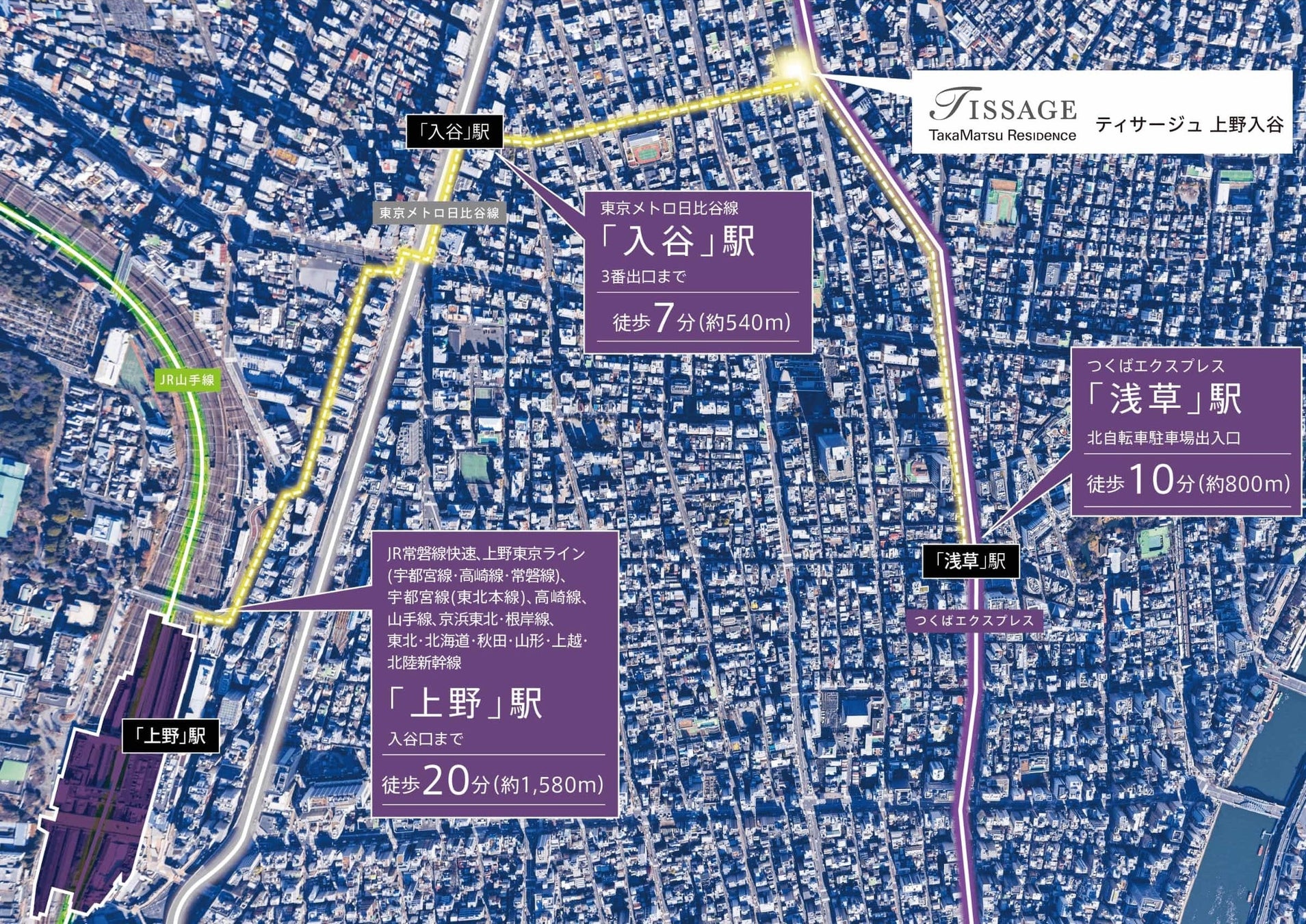 本物件は、日比谷線「入谷」駅徒歩7分、つくばエクスプレス「浅草」駅徒歩10分、JR「鶯谷」駅徒歩16分、ビッグターミナル「上野」駅徒歩20分と、都内主要エリアを自在に結ぶポジションに立地しています。