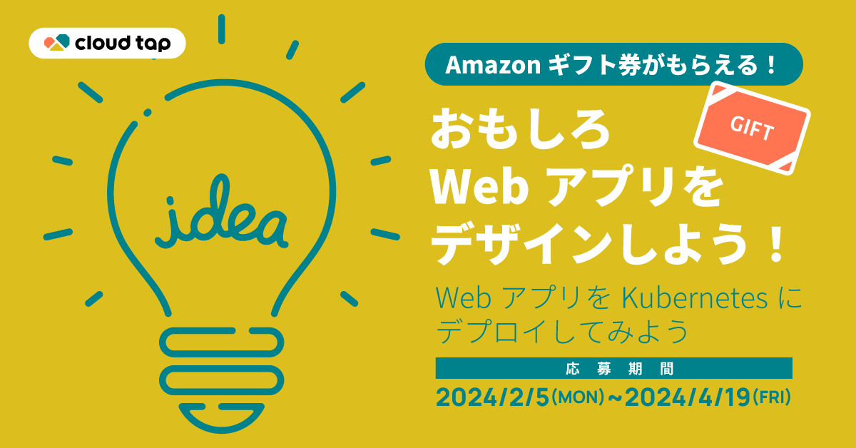 cloud tap、Amazonギフト券がもらえる『おもしろWebアプリをデザインしよう!コンテスト』 第2弾「WebアプリをKubernetesにデプロイしてみよう」を開催