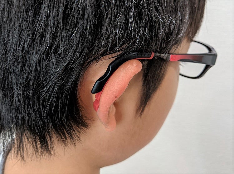 最大の特長は、フレームの先セル(耳にかける部分)に、耳の後ろまで巻き付く特殊形状の部品を採用している点です。眼鏡が一切ずり落ちないので、勉強中や運動中、スマホやタブレットの画面を見ている間も、正しいかけ位置を常にキープし、ピントが合った状態を保ちます。