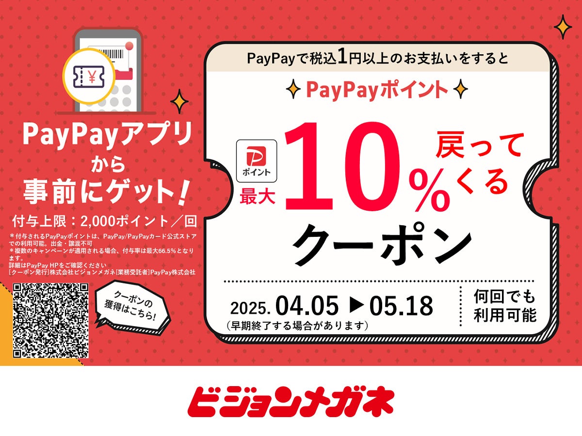 全国で眼鏡専門店を運営する(株)ビジョンメガネ(大阪市)は、スマートフォン決済サービス「PayPay」の利用で、最大10%のPayPayポイントを付与するキャンペーンを開催します。