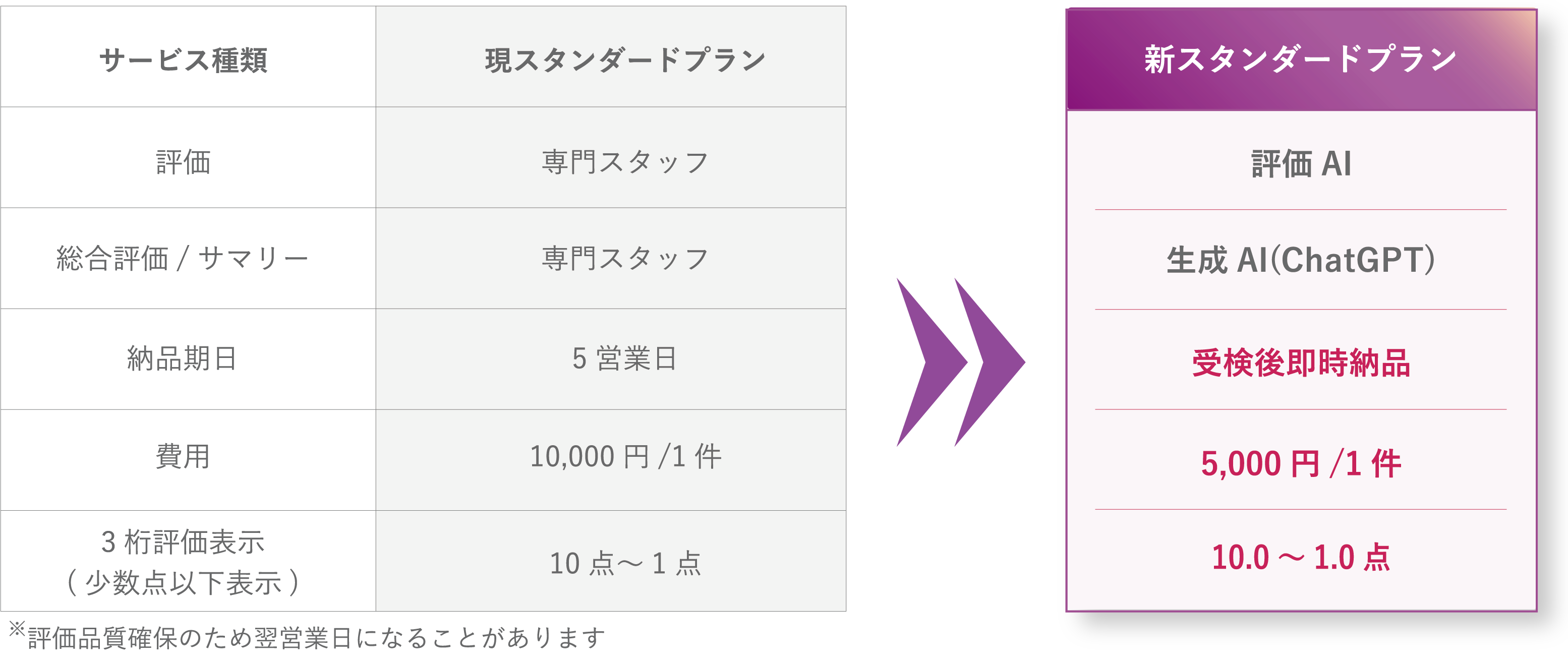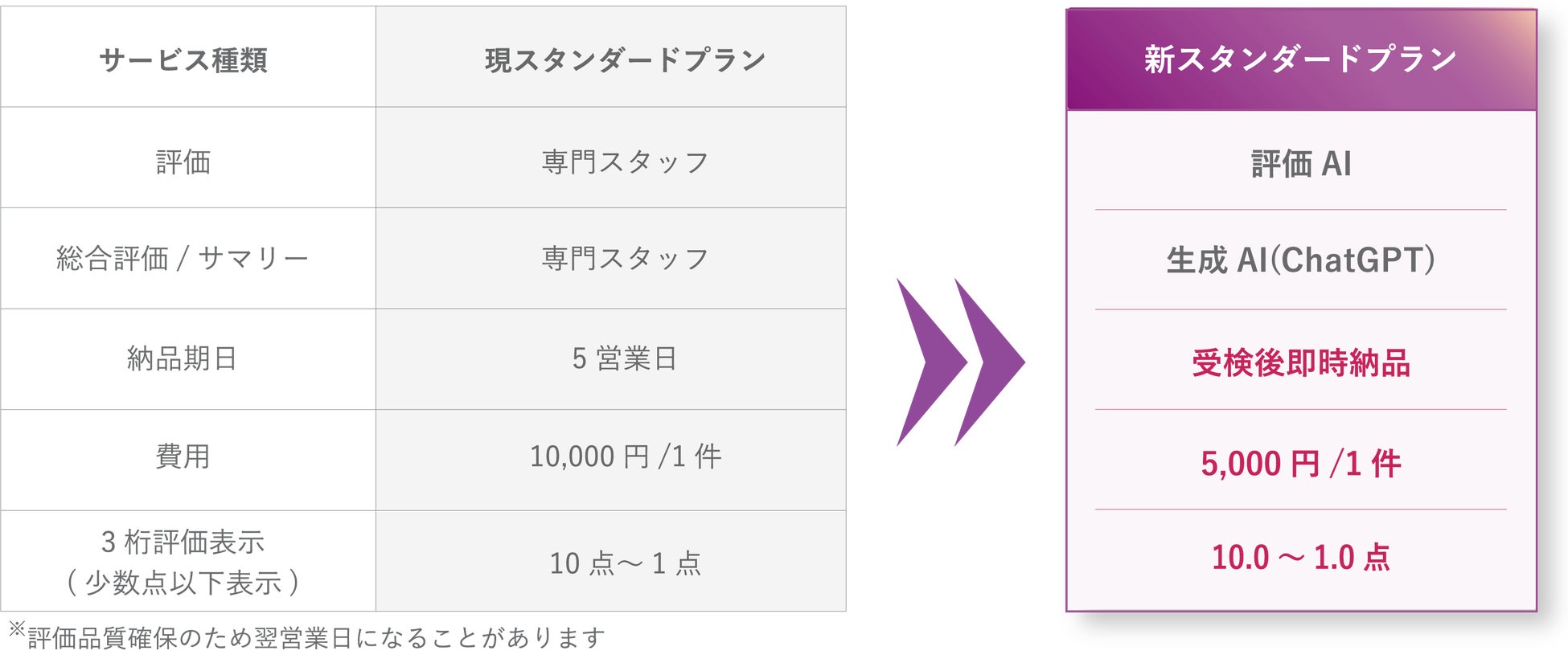 この評価AIの搭載に併せて、生成AI「ChatGPT」を導入することにより、面接評価レポート作成に関わる全ての工程の完全自動化に目処がついたことで「面接評価レポートの納期短縮」「利用料金の低廉化」を実現した新スタンダードプランを提供することにいたしました。