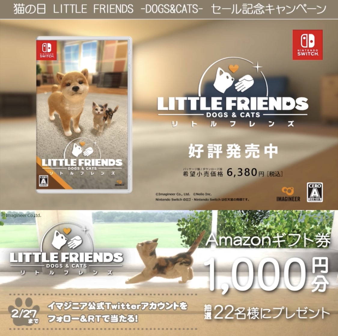 イマジニア株式会社(東京都新宿区、代表取締役社長 兼 CEO 澄岡和憲、以下「当社」)は、Nintendo Switch™ソフト「LITTLE FRIENDS –DOGS&CATS-」(以下、「本作」)について、累計出荷販売本数(※)が50万本を突破したしましたので、お知らせします。