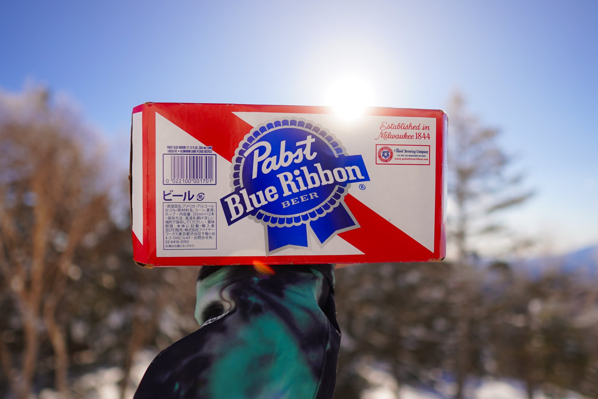 昔から海外のスノーボードムービーに出てるライダーたちがみんな PBR を飲んで遊んだりしているのを映像とか写真で見ていて、かっこいいビールだなと思っていました。
