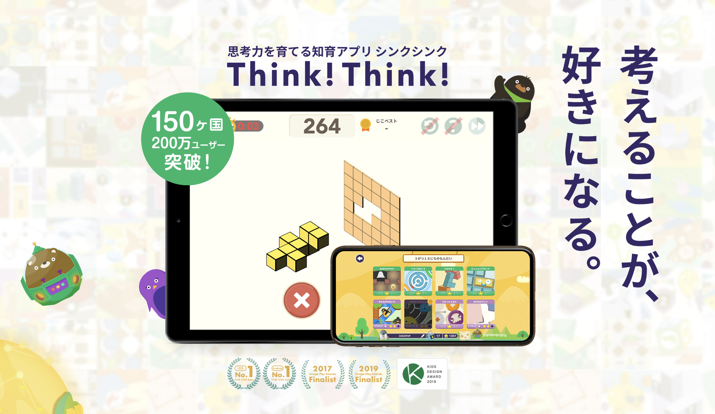 2017年にリリースした思考力育成アプリ「シンクシンク」は、日本e-Learning大賞 EdTech特別賞受賞、海外でGoogle Play Awards 2017/2019 TOP5選出(*1)(*2)など、国内外で高い評価を得ています。同アプリは抽象思考の基礎となる思考センスを育てる問題を多数収録し、世界中に配信しており、JICA・慶應義塾大学との実証実験では、学力・非認知能力の両面に高い効果が確認されています(*3)。