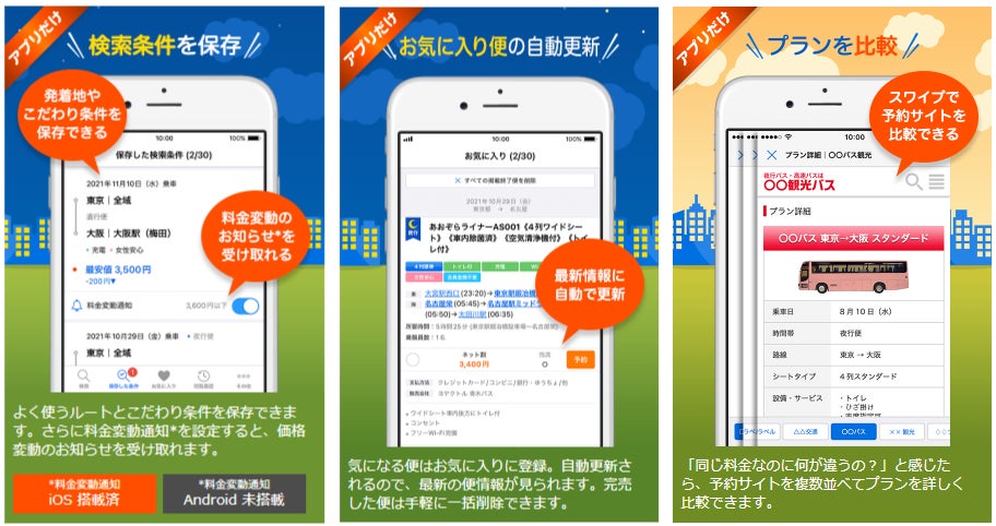 検索条件にマッチするバス便の「料金変動通知」を受け取れます。