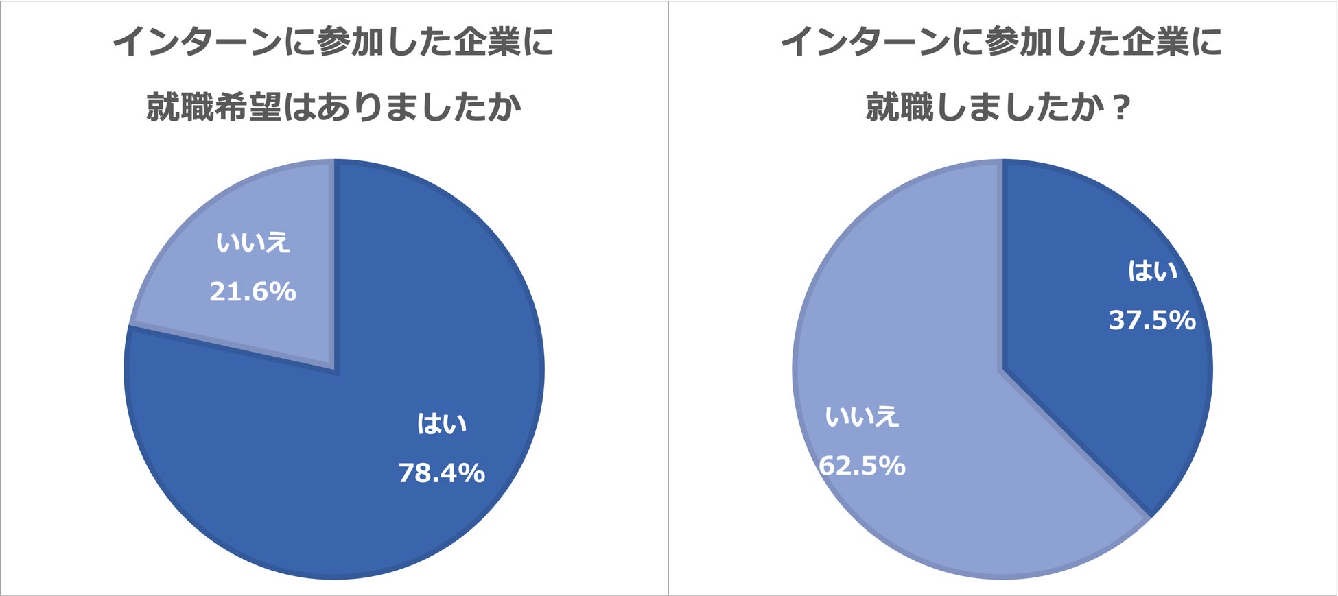 インターンに参加した企業に「就職を希望した」と回答したのは78.4%で、「希望しなかった」と回答したのは21.6%でした。また、インターン参加企業に内定をもらい実際就職をしたのは37.5%で、内定がもらえなかったと回答したのは62.5%の結果になりました。