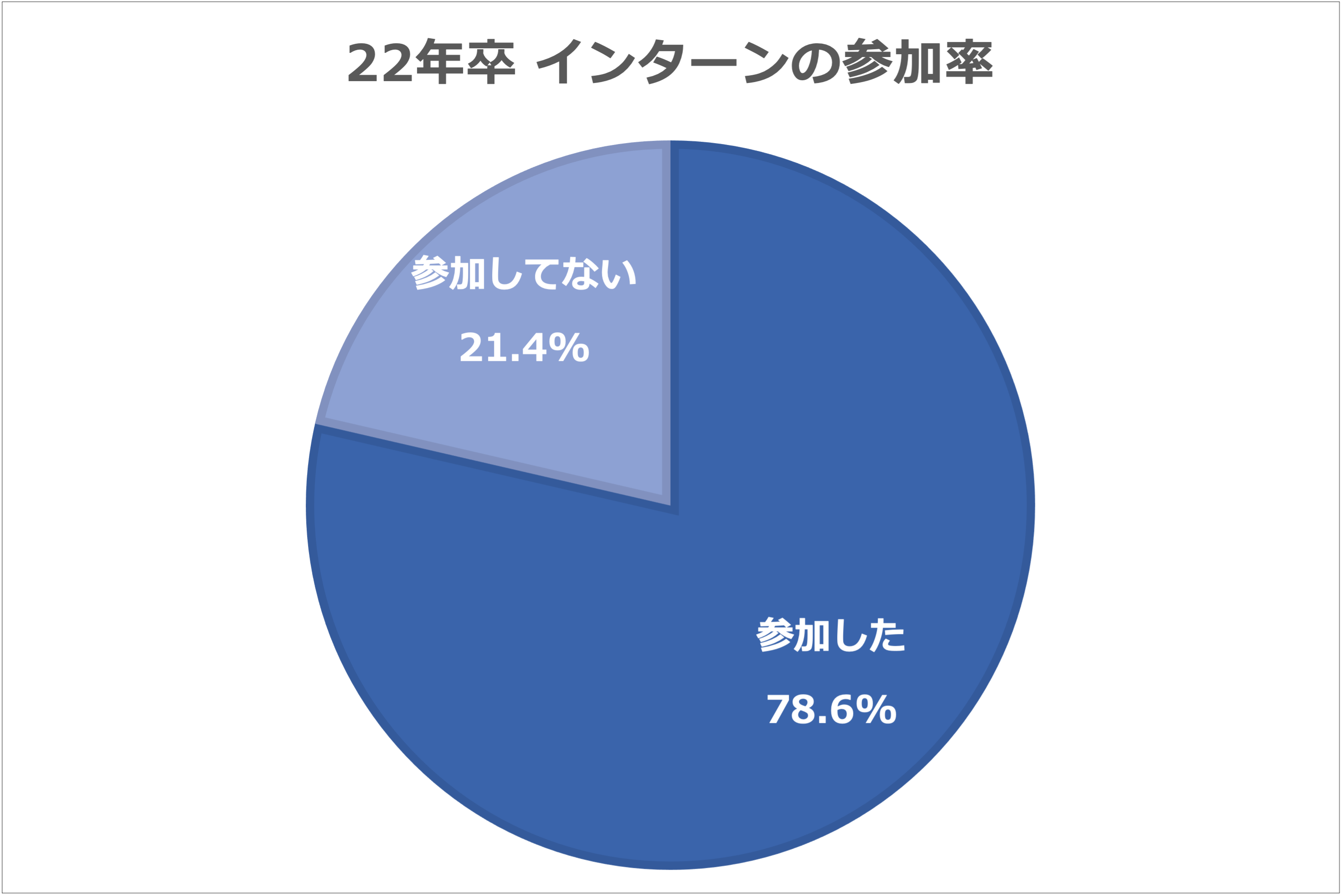 | 【TOPICS】 ・22年卒の78.6%が「インターンに参加した」と回答 ・インターンの参加社数は半数以上が5社内と回答 11社以上は23.7% ・インターンへの参加期間は67.7%が「1DAY」と回答 ・78.4%がインターン参加企業に就職を希望したと回答 ・インターン参加企業に実際内定をもらったのは37.5% |