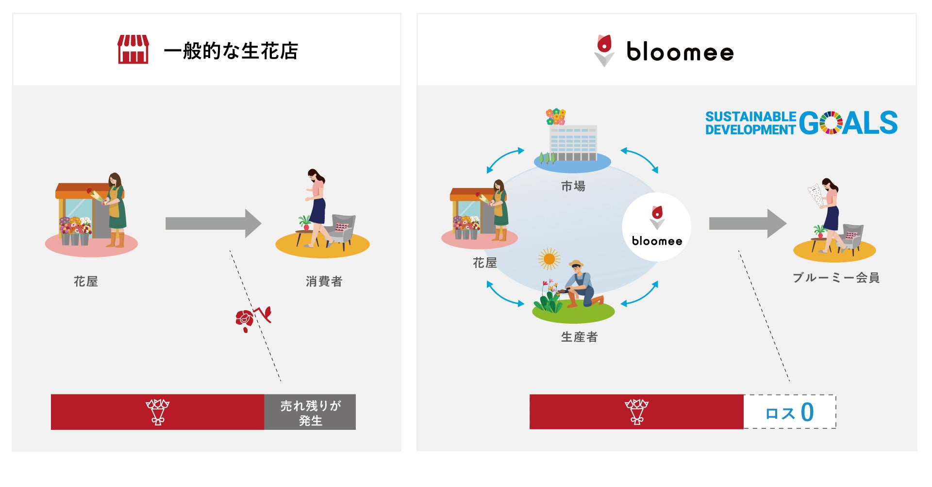 ブルーミーは、日本最大の花き市場である大田花きや複数の花き市場と提携し、通常の市場流通している花に加え、品質が良好でも規格外と判断され価値がつきにくくなる花を、独自規格「ブルーミー規格」とし、適性価格で独自買い付けも行っております。 市場や生産者と協力することで、売れ残りなどのロスを減らし、日本中のサスティナブルな花消費に貢献して参ります。 今後も、国内における花消費の普及に取り組み、サブスクリプションサービスだけでなく複数業態とのコラボレーションも強化し、より一層「お花のある生活を日常にする」ことを目指します。