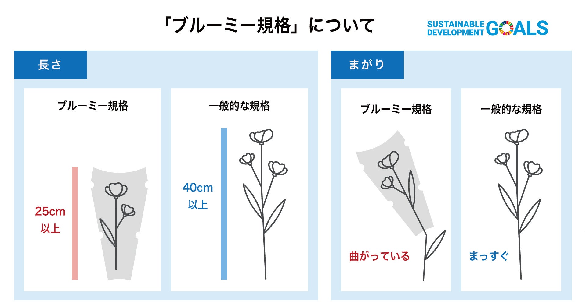 花には茎の長さなどの「規格」が存在し、品目や地域ごとに基準が定められています。品質が良好でも規格外と判断され、価値がつきにくくなるものがあります。サービス独自規格「ブルーミー規格」は、規格外の花も含め適正価格で独自に買い付けしているお花です。