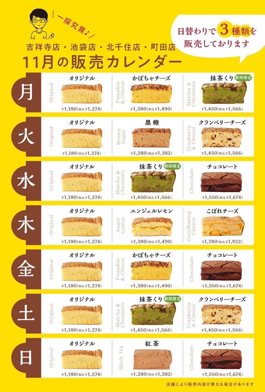 曜日ごとに3種類のお味を、毎日焼き立てで提供しております。