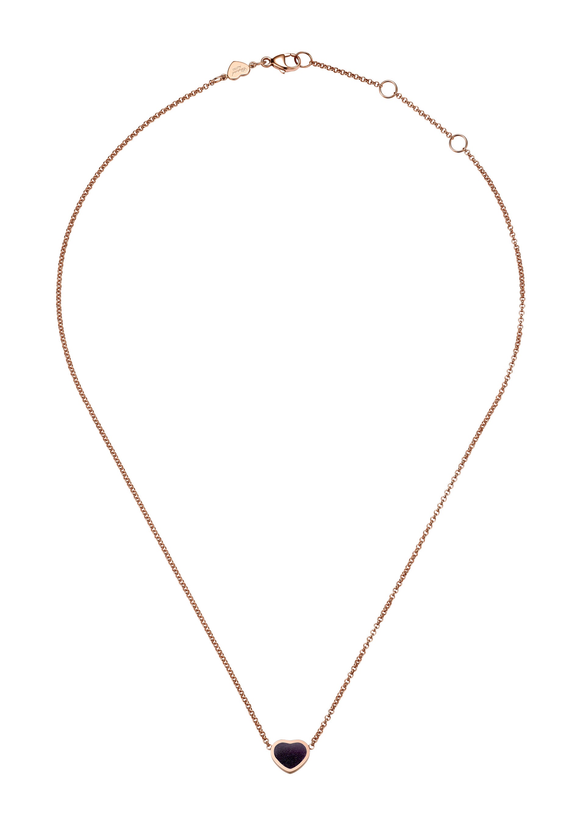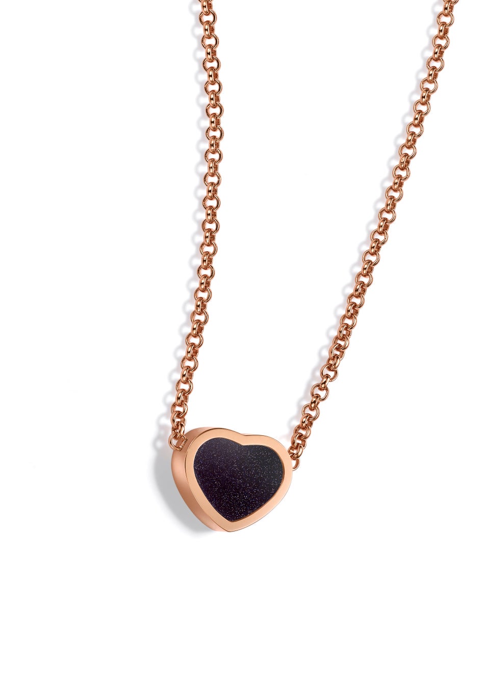 今回コレクションに加わったジュエリーは、18Kエシカルローズゴールドにブルーアベンチュリンガラスがセットされたネックレスです。そのコズミックな外観と煌めくインクルージョンを宿すアベンチュリンガラスは、“偶然”がもたらした産物とも言われています。17世紀、ムラーノの工房である職人が融けたガラスの中に銅の削りくずを誤って落としてしまったと伝えられています。この興味深い結果が、イタリア語で「偶然」を意味する「peravventura」にちなみ「アベンチュリン」と名付けられました。星空を想起させるゴールドに輝くインクルージョンを宿したこのネイビーブルーのガラスは、すでにショパールのウォッチの文字盤やジュエリーにもあしらわれていますが、タリスマンジュエリーである「マイ ハッピーハート」に採用されるのは今回が初です。ロマンティックなホリデーシーズンに捧げるこのネックレスは、100本の日本限定コレクションです。どうぞ、お見逃しなく…!