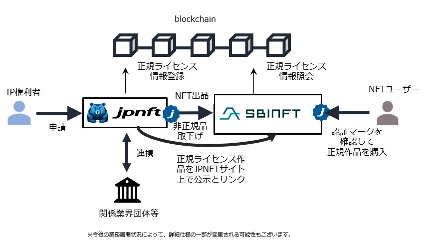 この課題を解決すべく、SBINFTとJPNFTは、“安心安全なNFTマーケット”を構築し、利用者の皆様に正規のNFTを提供することを使命に、両社の強みをいかしてパートナーシップを結ぶことにいたしました。JPNFTが運営する、コンテンツIPのNFTに関する公式情報公示プラットフォーム「jpnft」に登録・公示されたコンテンツをSBINFTが運営する「SBINFT Market」にて取引する場合には、jpnftでの正規ライセンス情報照会やjpnft認証マークの表示を通じて、正規NFTであることを確認できるようにします。