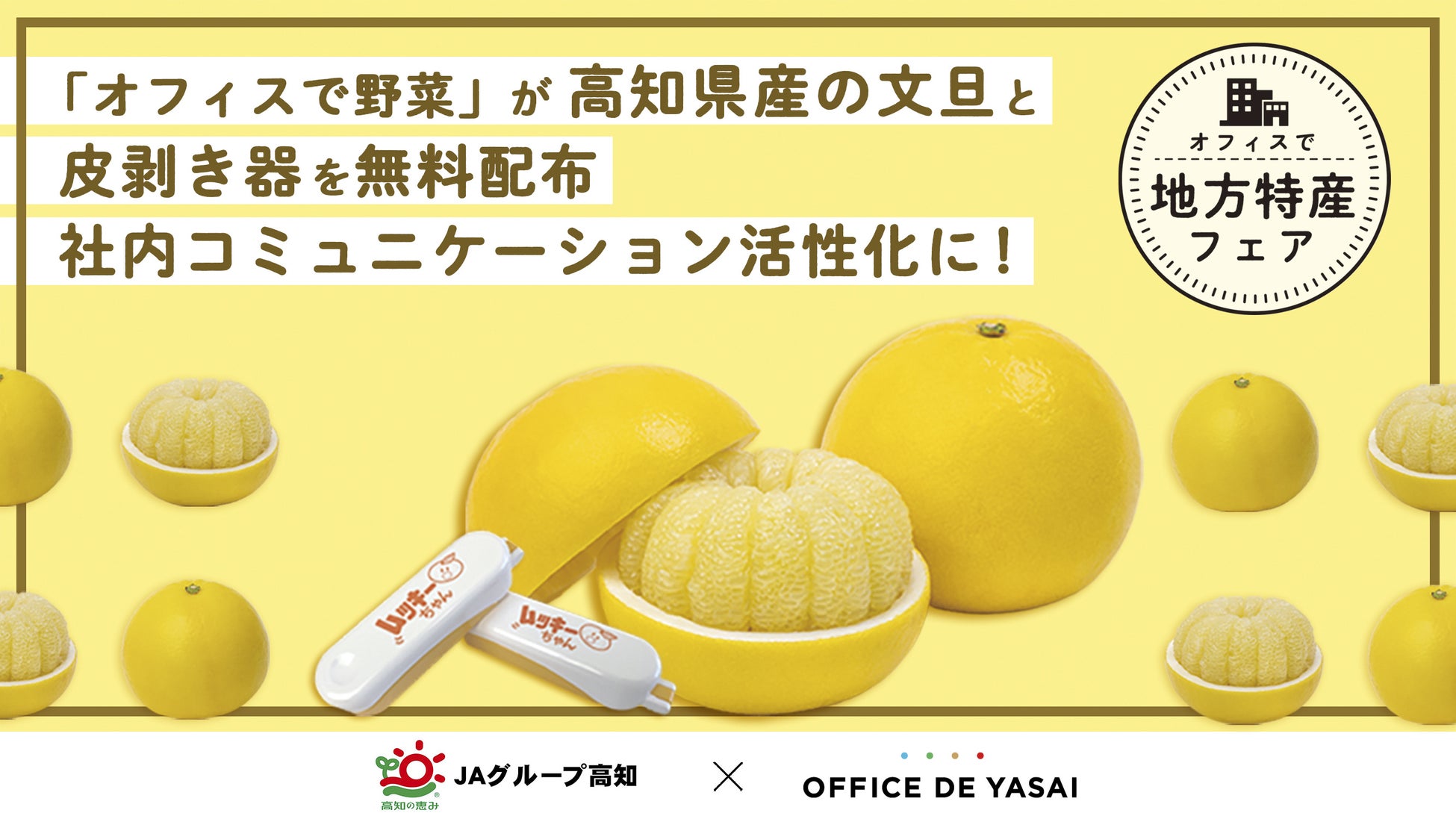 今回は高知県とJAグループ高知で構成する高知県園芸品販売拡大協議会と、高知県産土佐文旦のプロモーションを実施いたします。文旦を丸ごと1個と、皮むき器“ムッキーちゃん“(クリハラワールド社製)を一緒にオフィスへお届けし、OFFICE DE YASAI の売り場において無料サンプリングいたします。