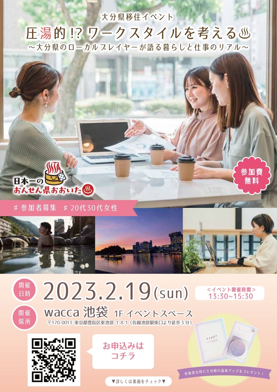 大分県は、実際に移住や現地での起業を経験したキャリアコンサルタント、経営者などを招き、大分の暮らしや仕事のリアルを伝える移住相談イベント「圧湯的!?ワークスタイルを考える〜大分県のローカルプレイヤーが語る暮らしと仕事のリアル〜」を2月19日(日)、wacca池袋1階イベントスペースにて開催いたします。