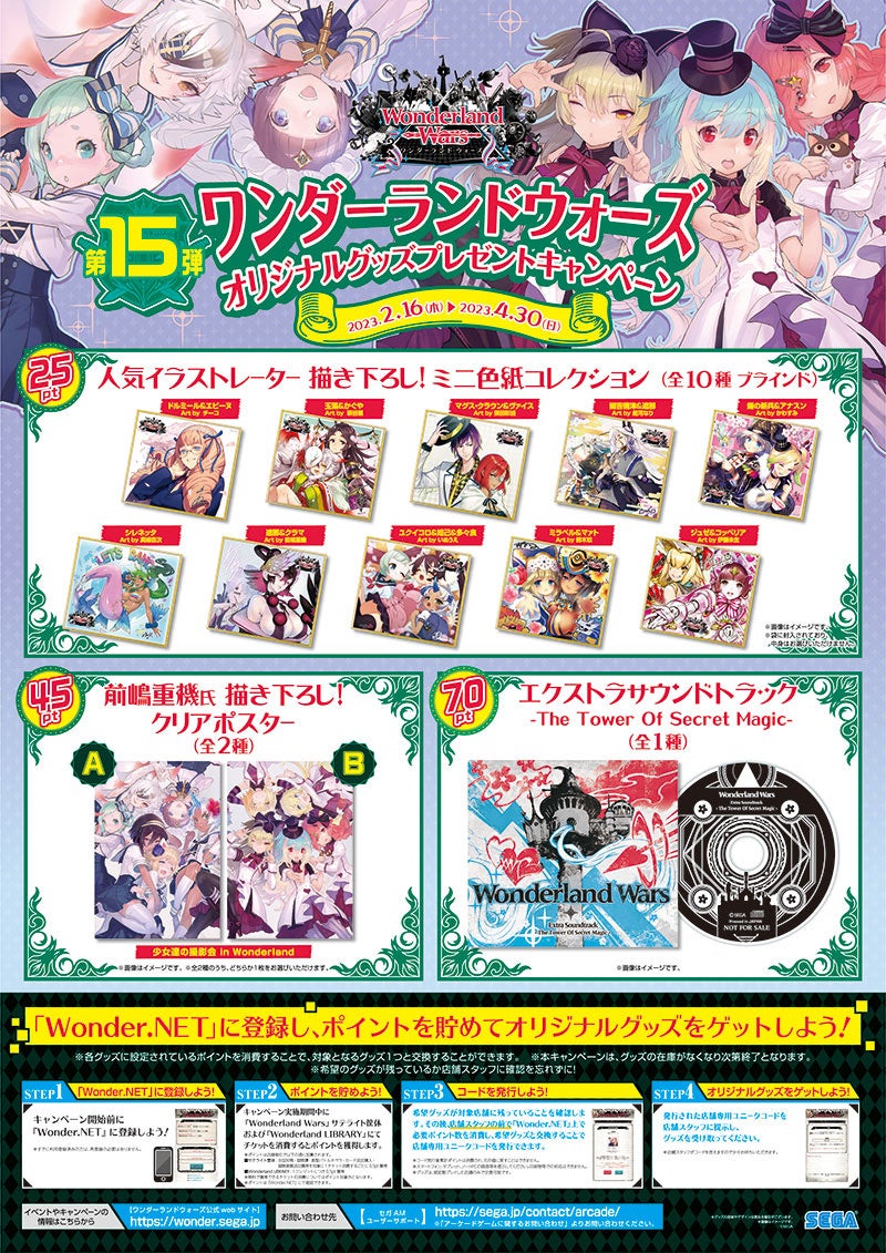 「Wonder.NET」に登録し、期間中にキャンペーン実施店舗にて『Wonderland Wars』をプレイすることで「エクストラサウンドトラック 【-The Tower Of Secret Magic-】」「前嶋重機氏 描き下ろし!【クリアポスター】」「人気イラストレーター 描き下ろし!【ミニ色紙コレクション】」といった豪華なオリジナルグッズを獲得することができます!