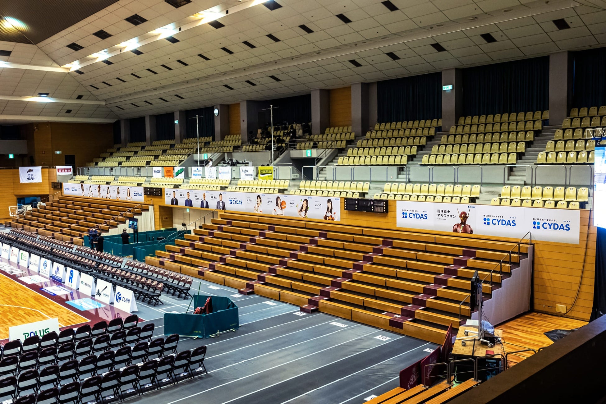 体育館をアルファーズ33名の「見える化横断幕」で彩る