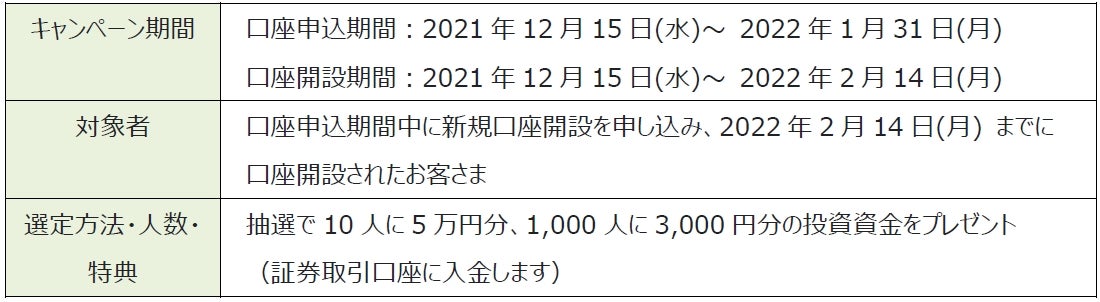 キャンペーン期間中にキャンペーンコードを入力の上、新規で口座開設を申し込み、開設されたお客さまの中から抽選で10人に5万円分、1,000人に3,000円分の投資資金をプレゼントします。
