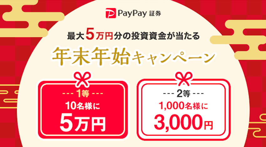 「資産運用を、より身近に。」をミッションに運営するスマホ証券 PayPay証券株式会社(東京都港区、代表取締役:内山 昌秋、以下「PayPay証券」)は、資産運用への一歩を踏み出したいと考えるお客さまを応援する「年末年始キャンペーン」を実施します。2021年12月15日(水)から2022年1月31日(月)に新規で口座開設を申し込み、2022年2月14日(月)までに開設されたお客さまの中から抽選で10人に5万円分、1,000人に3,000円分の投資資金が当たるキャンペーンです。