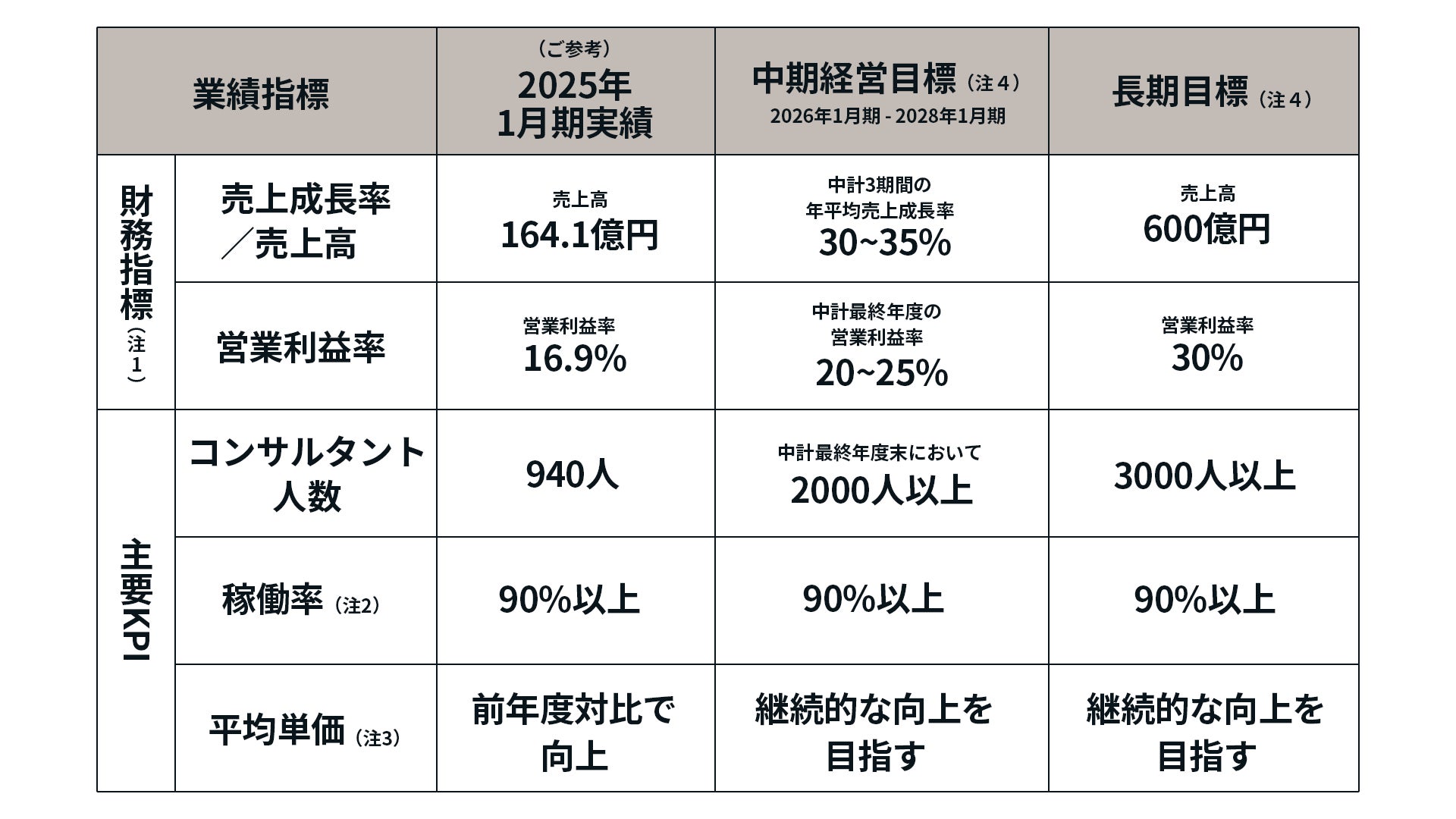当社は、売上高の成長と営業利益率の向上を目指す上で、コンサルタントの人数/稼働率/平均単価の3つの要素を重要視しております。経営目標達成に向けて、当社では、これまで行ってきた「ファンづくりサイクル」(注1)という仕組みを引き続き活用し、採用活動/組織運営/営業活動・コンサルティングサービスそれぞれにおいて、当社のファンを増やし、ビジネスのストック性を向上させ、競争優位性をさらに高めてまいります。