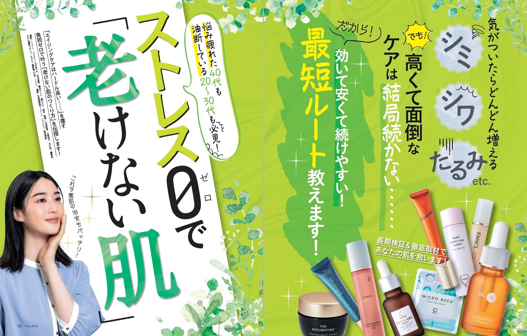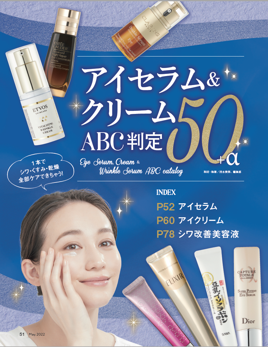 5月号では、新作から定番までUV下地18製品を集めて一斉テスト! 強い日差しから肌を守って美肌も叶える、今すぐ使うべき理想の1本を探しました。さらに、「ストレスゼロで老けない肌」を総力特集。手間なく簡単に“脱老け肌”を実現する、マイクロニードルパッチやシワ改善美容液、化粧水&乳液のベストを発表します。そのほかにも、1本でシワ・くすみ・乾燥を全てケアできるアイクリームや、アカ抜け眉になれるアイブロウマスカラなど、キレイを叶える情報盛りだくさんでお届けしています!