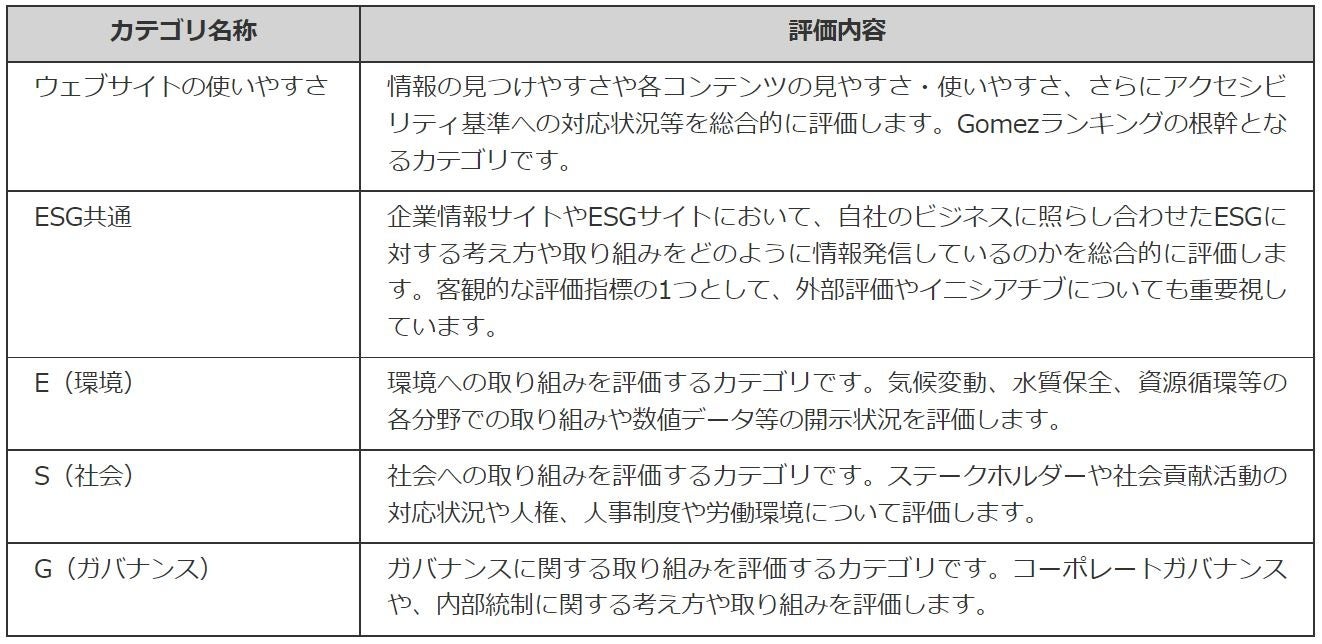 当社のESGサイトランキング調査では、調査項目は「ウェブサイトの使いやすさ」「ESG共通」「E(環境)」「S(社会)」「G(ガバナンス)」の5つの切り口から成り、主要ユーザーである株主・投資家だけではなく、幅広いステークホルダーの視点を盛り込んで設定されています。今年で3回目を迎えるESGサイトランキング調査では、例年に続き、国内外における非財務情報に関する制度改正、トレンドや社会的課題への注目度といった新規の要素も取り入れながら、これらをGomezのアナリストが評価し、総合的に優れたESGサイトのランキングを決定します。