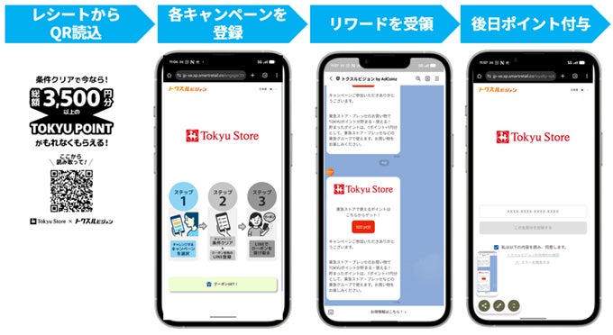 今回の導入により、東急ストアの利用者は、店内に設置されたサイネージや発行されたレシート、またはLINE経由で「トクスルビジョン」のキャンペーンページにアクセスし、広告視聴などの簡単なアクションを行うだけで、TOKYU POINTを獲得できるようになります。獲得したポイントは、東急ストアでのお買い物にご利用いただけます。