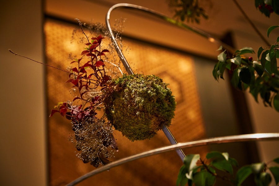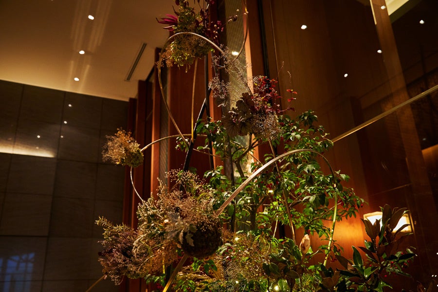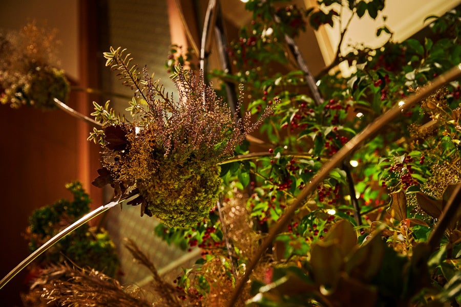 まさに、以前の活気を取り戻そうとする世の中の動きと重なり合った素晴らしいツリーが誕生いたしました。冬至の祭に“生命の象徴”として冬でも葉を枯らさずにいる常緑樹を用い、生命活動の源である「鉄」という地球を巡る普遍的な要素を織り交ぜ、動きをもたせた躍動感のあるフォルムに仕立て「エネルギーの流れ」を表現。また、寒い冬から芽吹き始める春への希望の姿を、日本在来の植物を中心に外来種も織り交ぜながら、約50種の色とりどりの種類豊富な植物にて巧みに演出、クリスマスオーナメントの華やかさも感じていただけるアレンジメントに仕上げました。